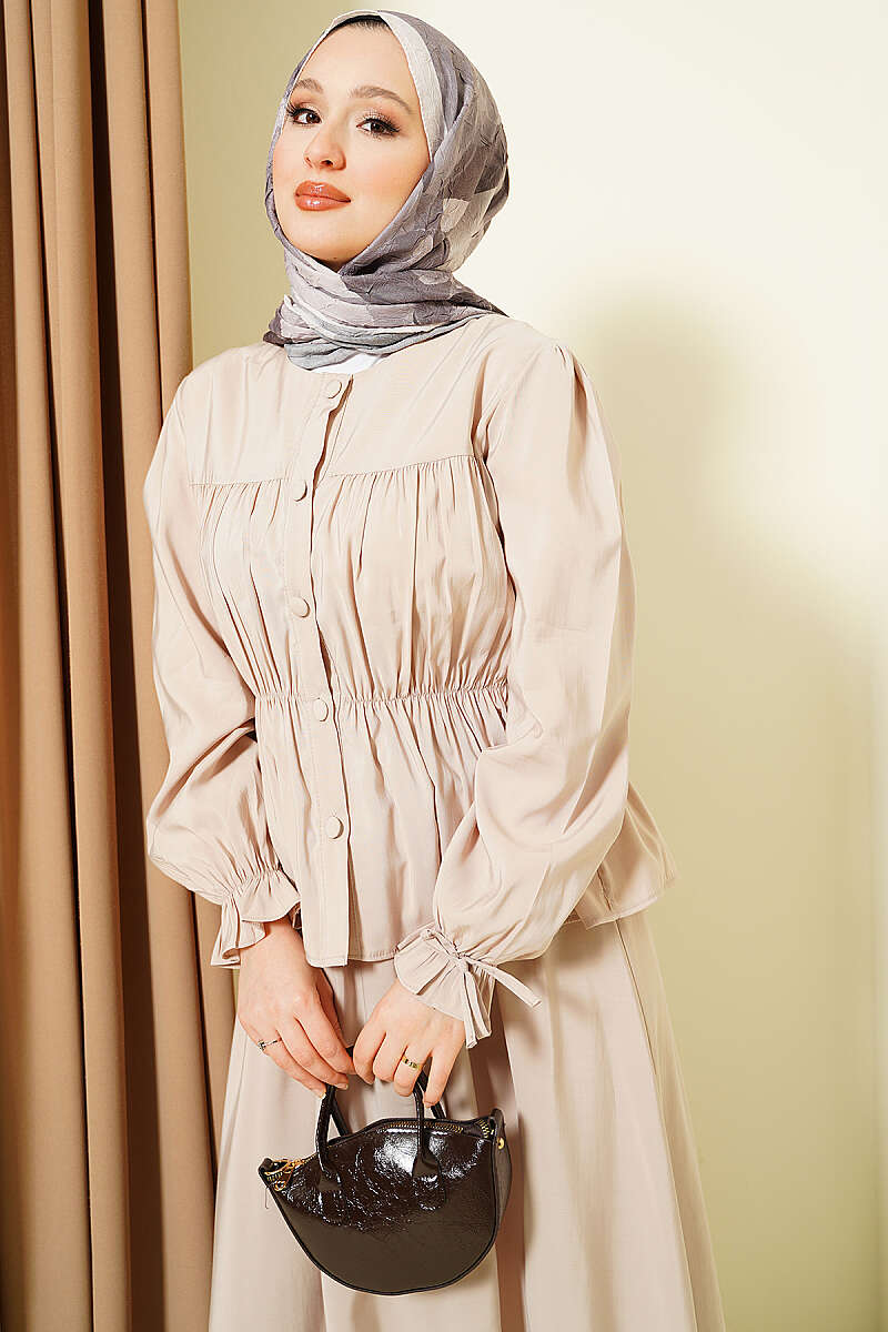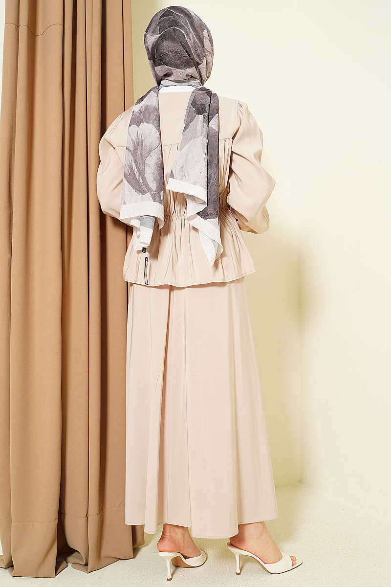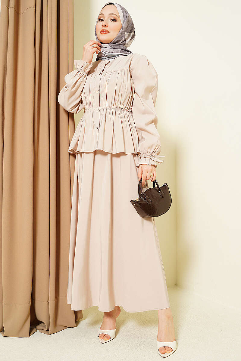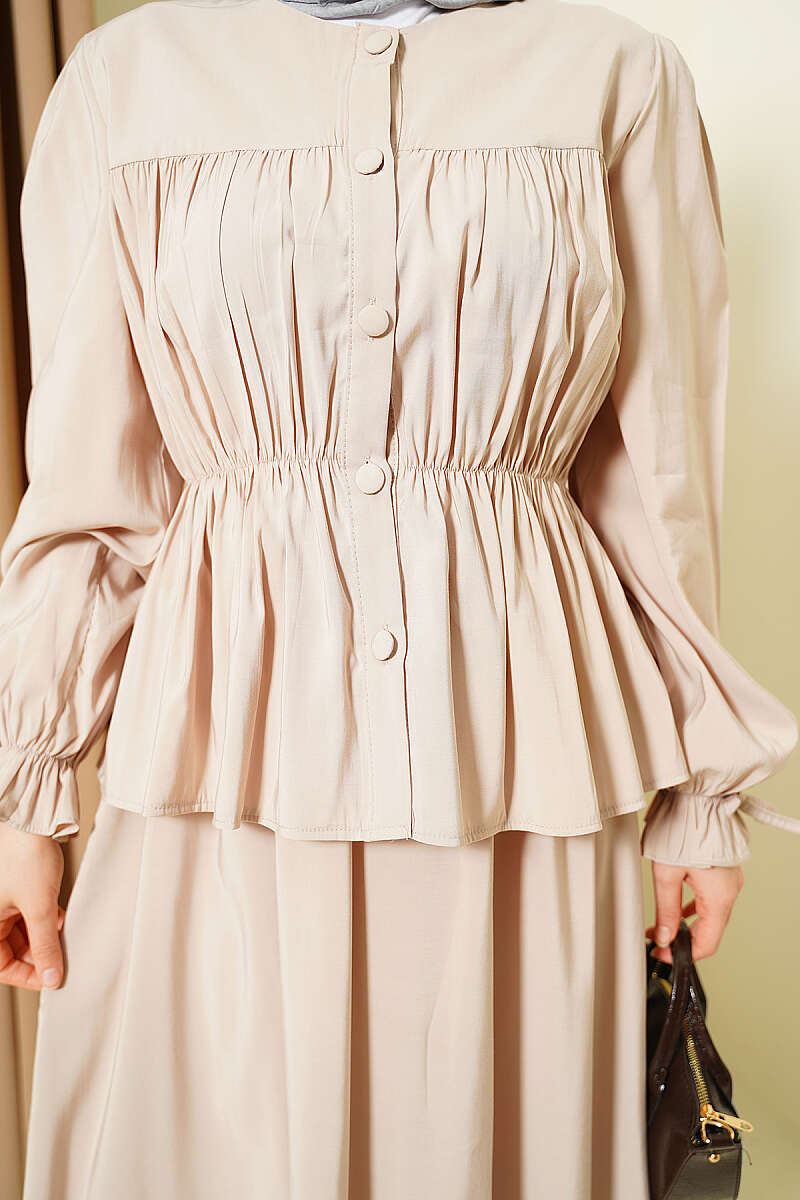 Bel Lastikli Büzgülü Etekli İkili Takım Bej