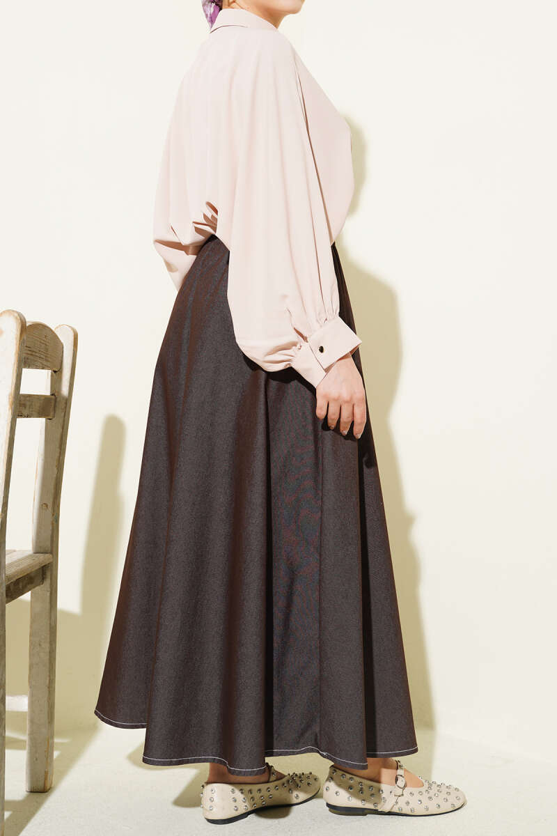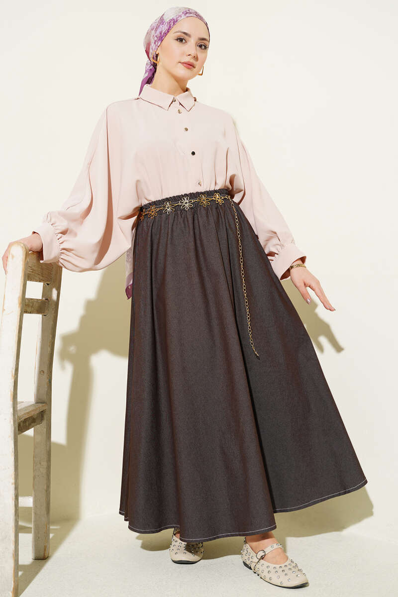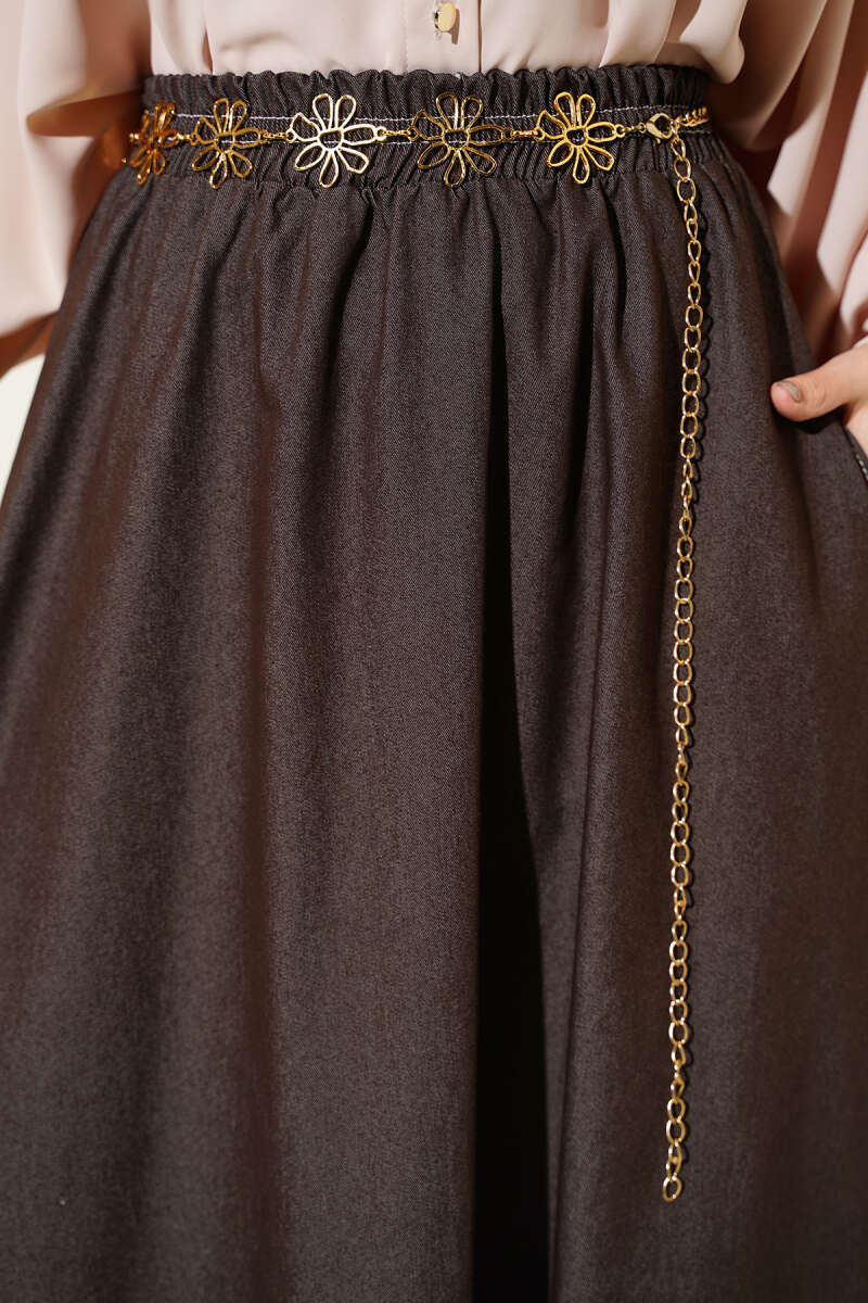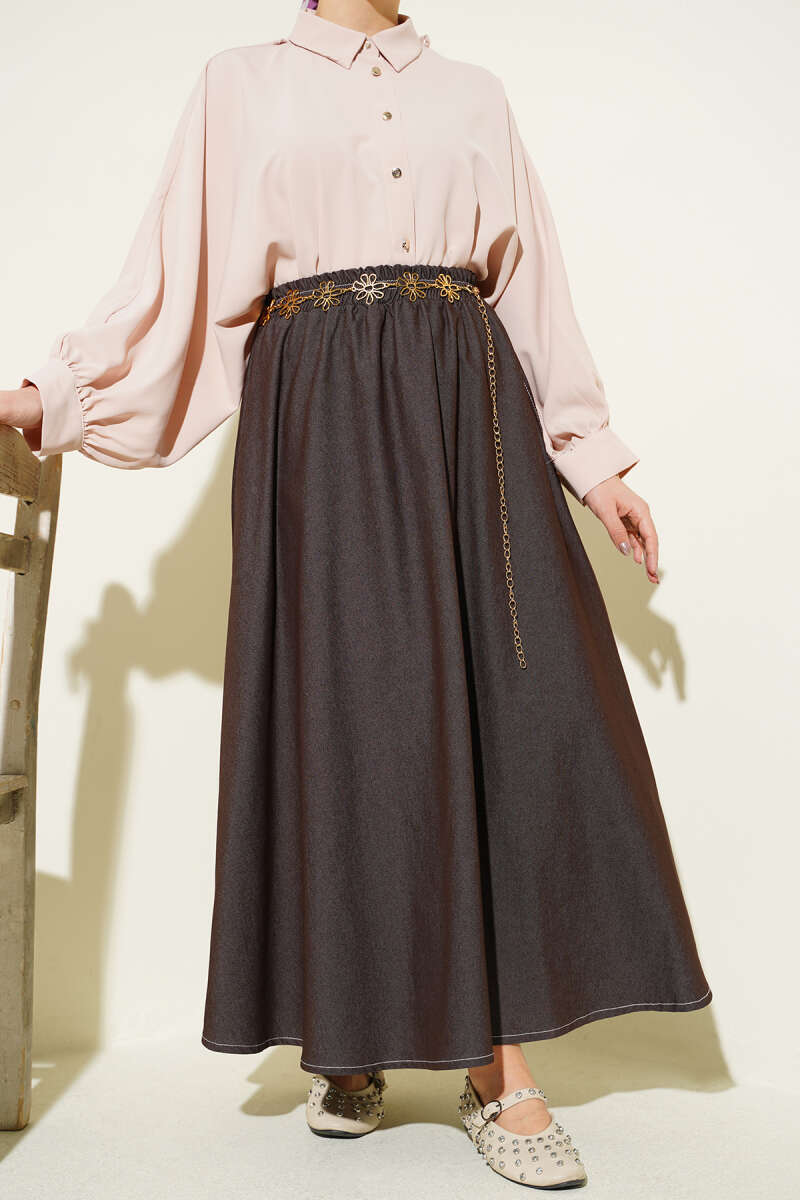 Bel Lastikli Cep Detaylı Kot Etek Kahve