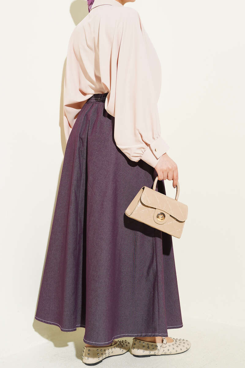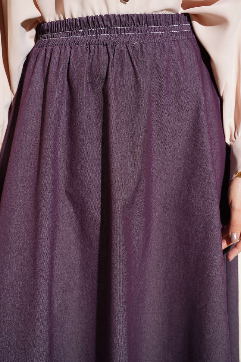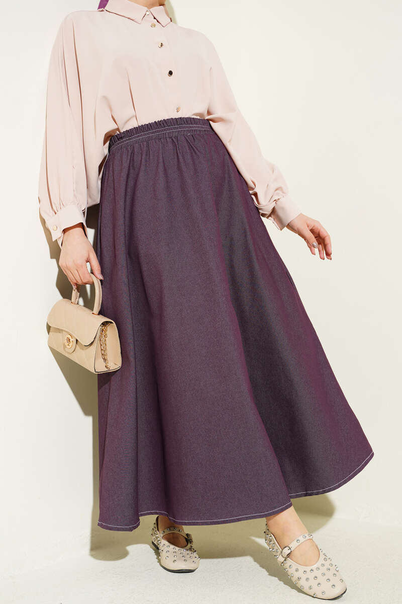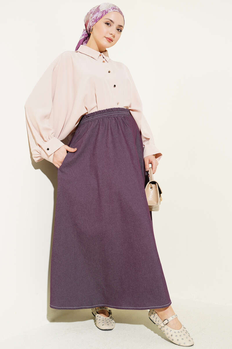 Bel Lastikli Cep Detaylı Kot Etek Mürdüm