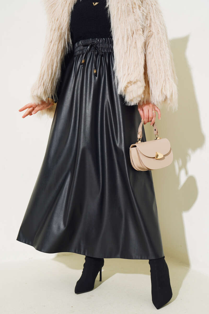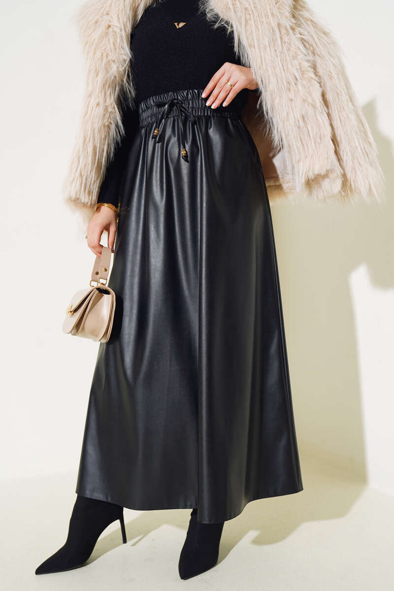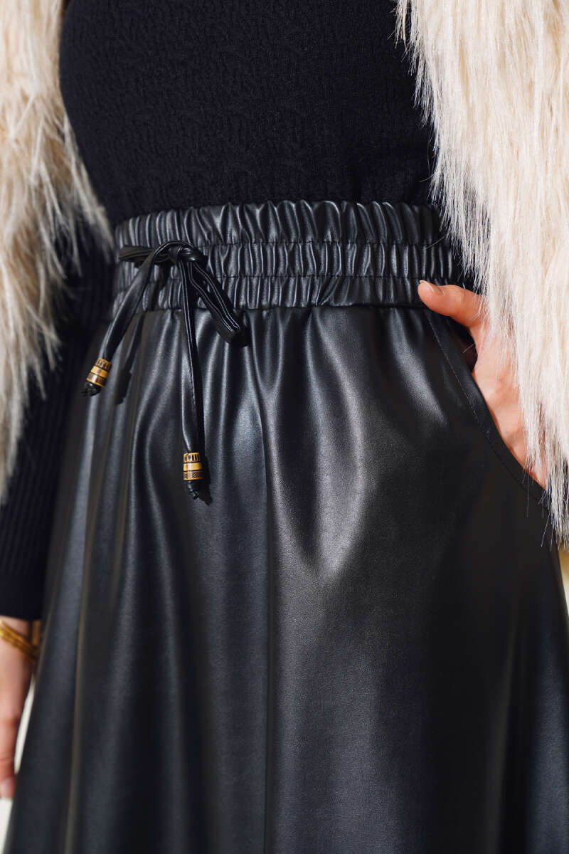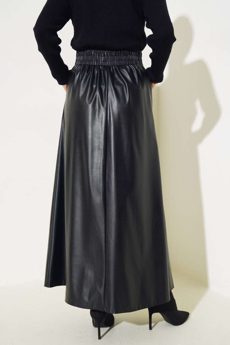 Beli Kemerli Lastikli Pileli Etek Siyah