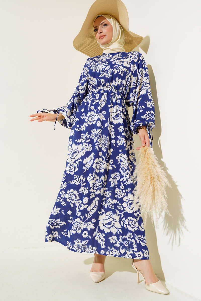 Paisley Desen Bel Lastikli Elbise İndigo