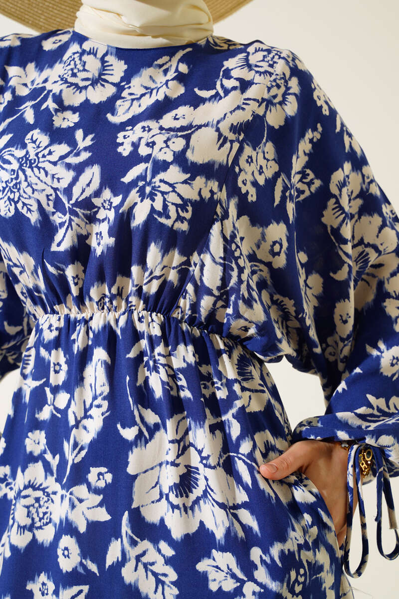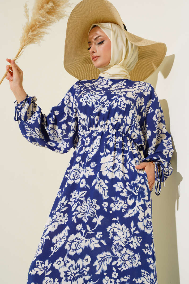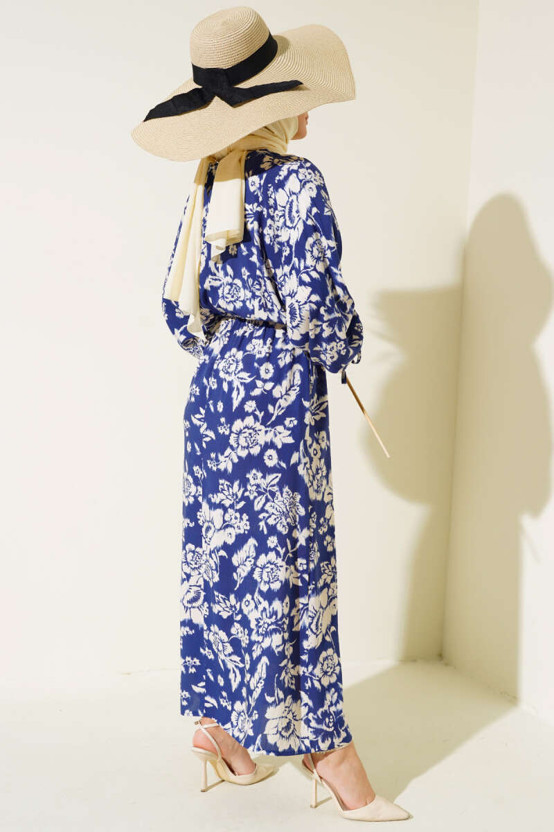 Paisley Desen Bel Lastikli Elbise Lacivert