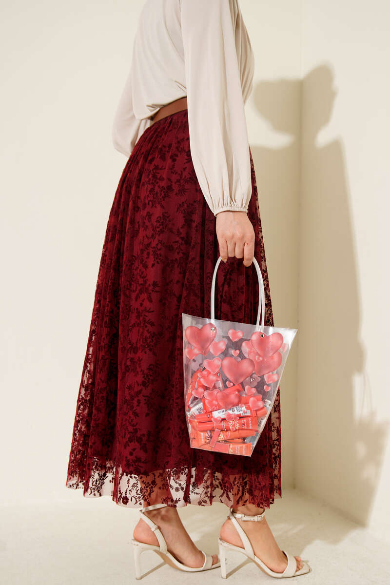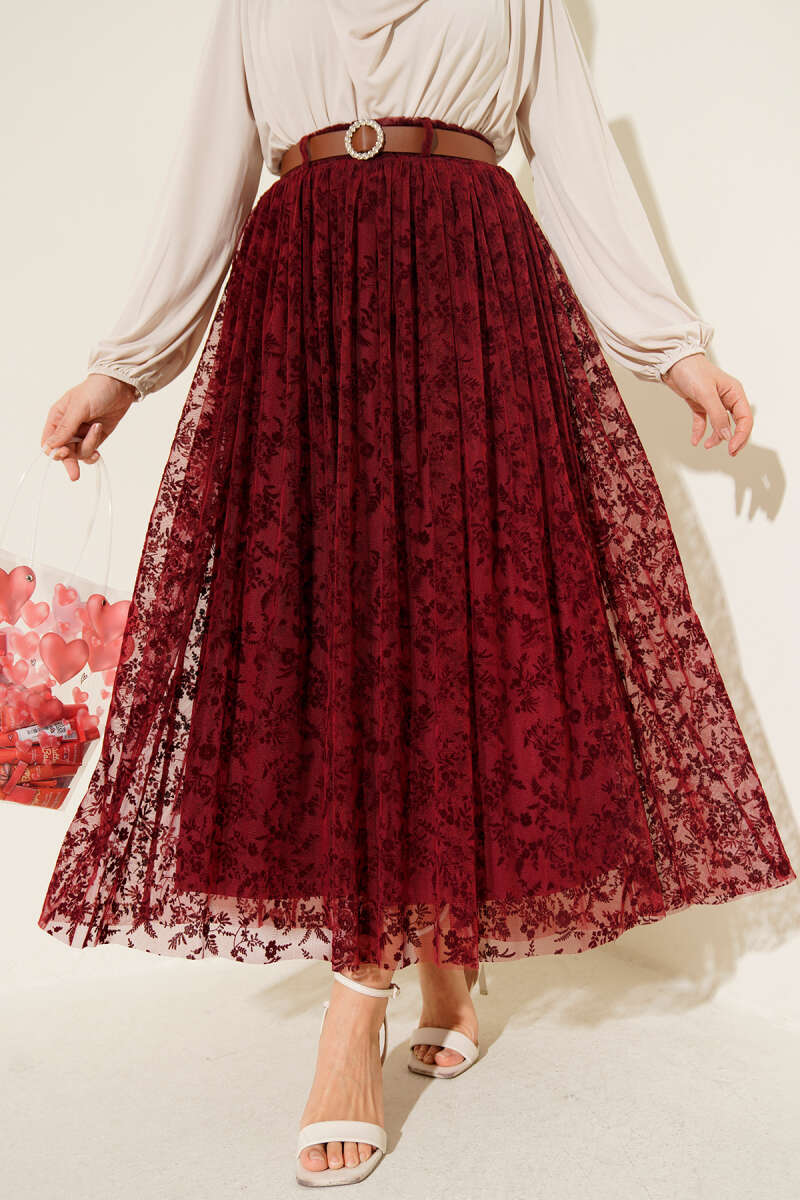 Bel Lastikli Çiçek Desen Tül Etek Bordo
