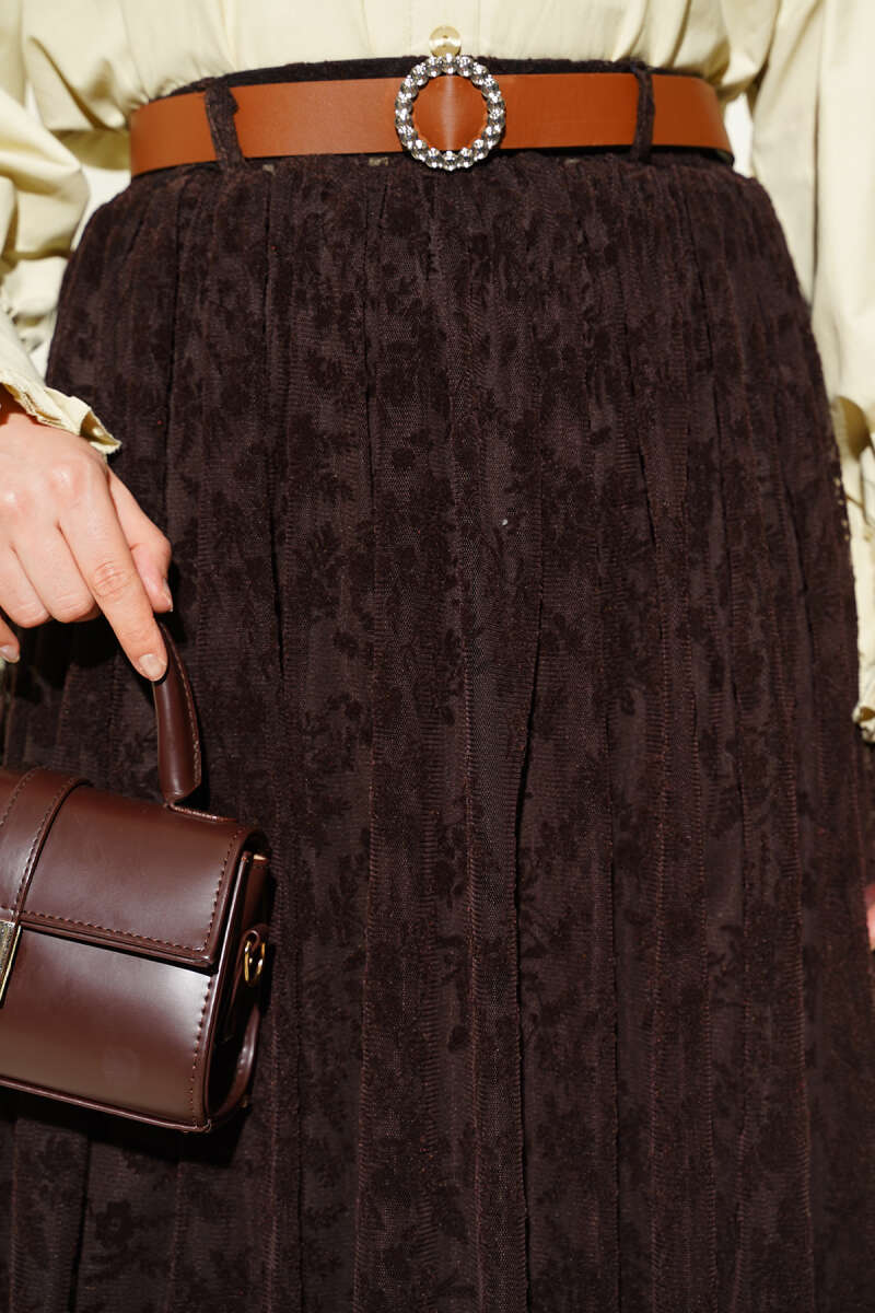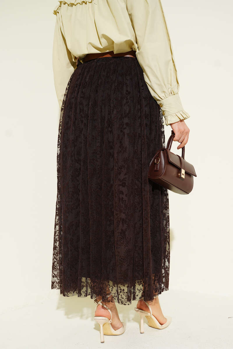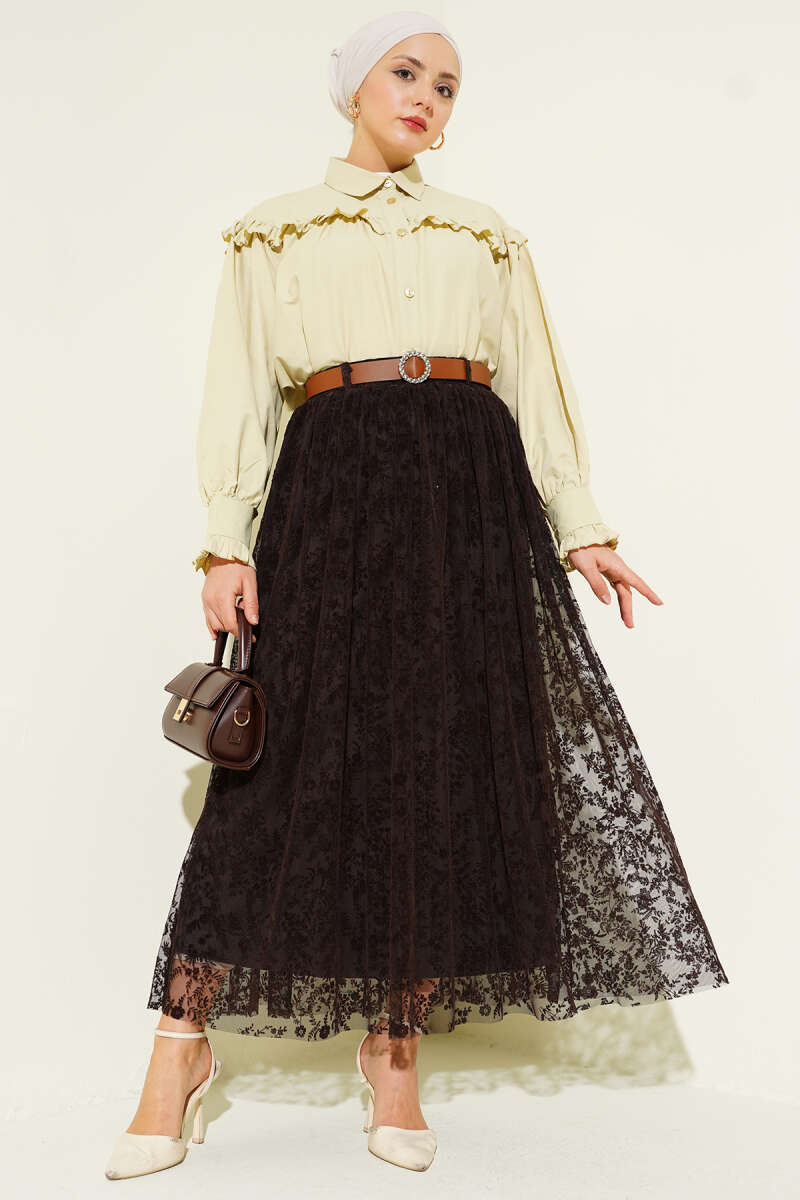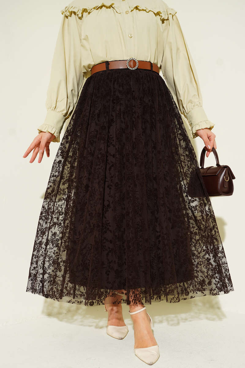 Bel Lastikli Tül Çiçekli Etek Kahve