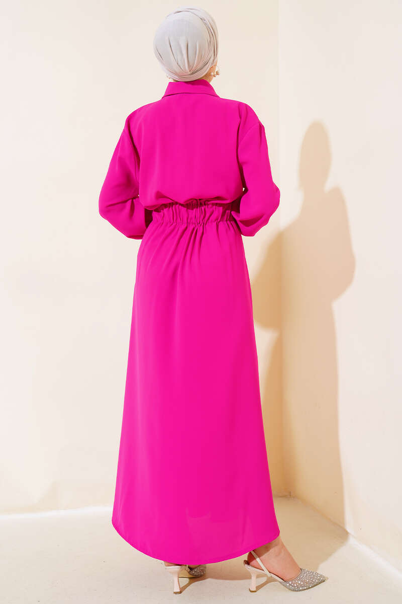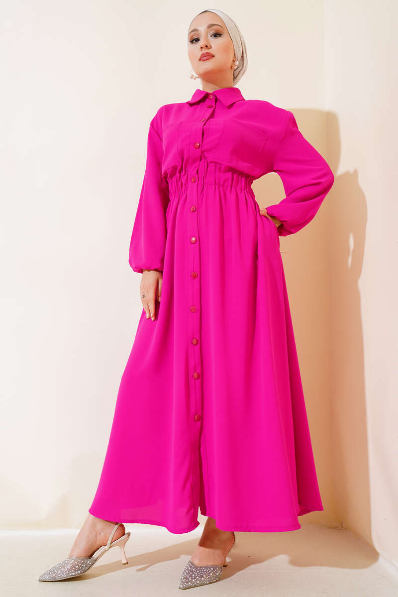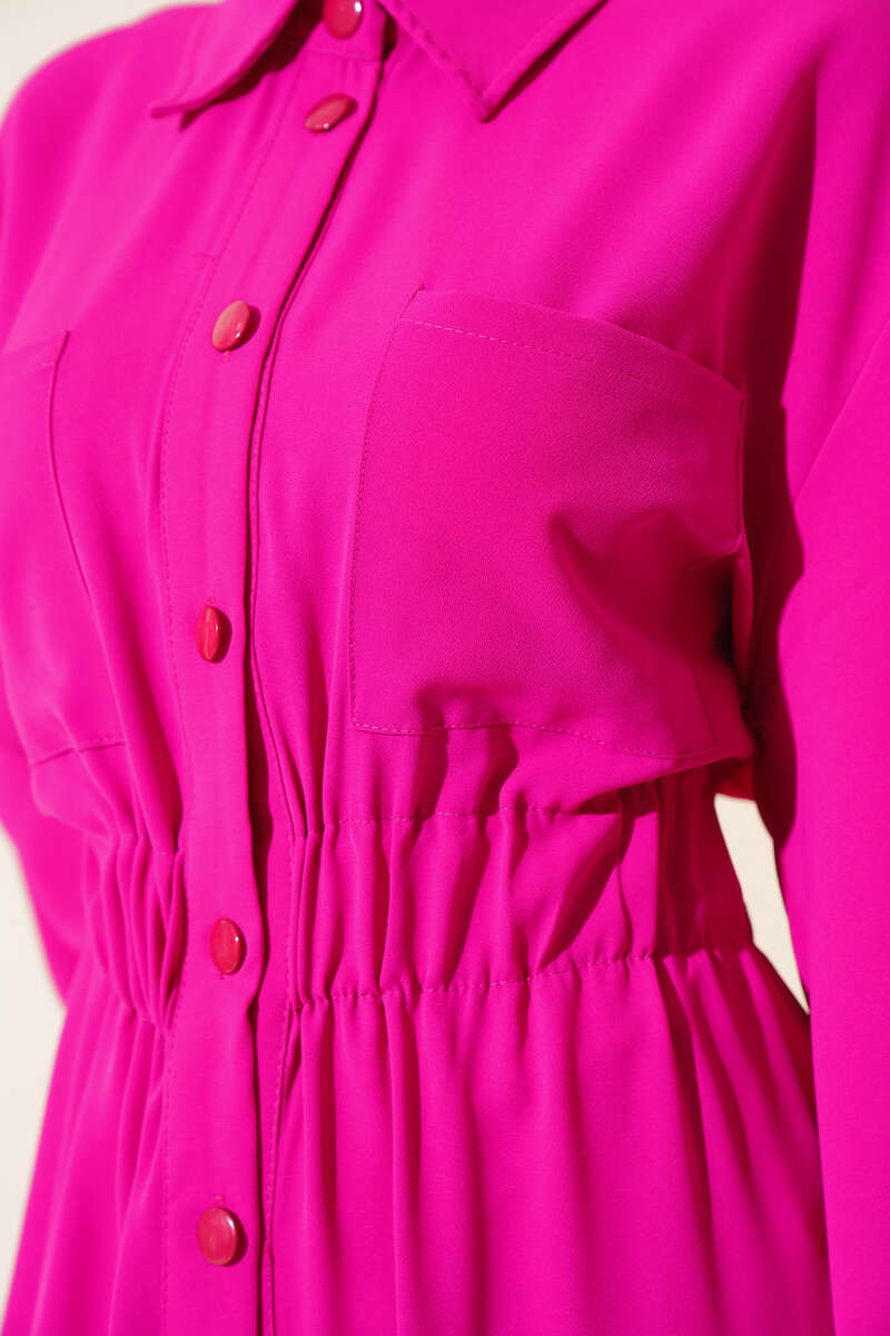 Bel Lastikli Çİft Cepli Elbise Fuşya