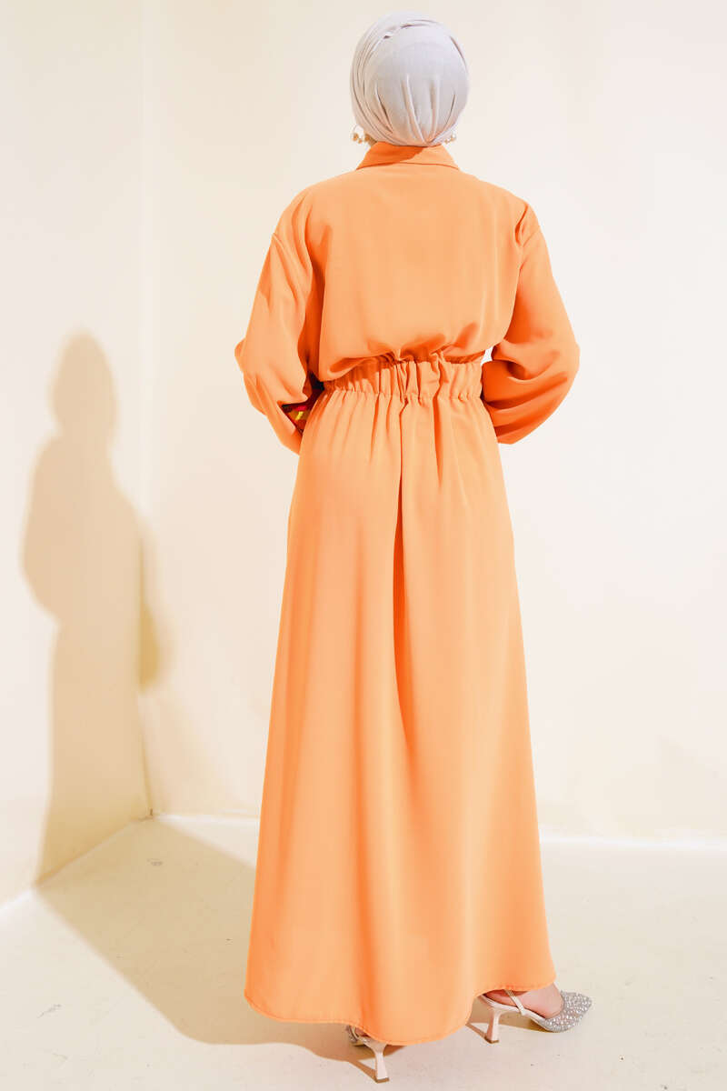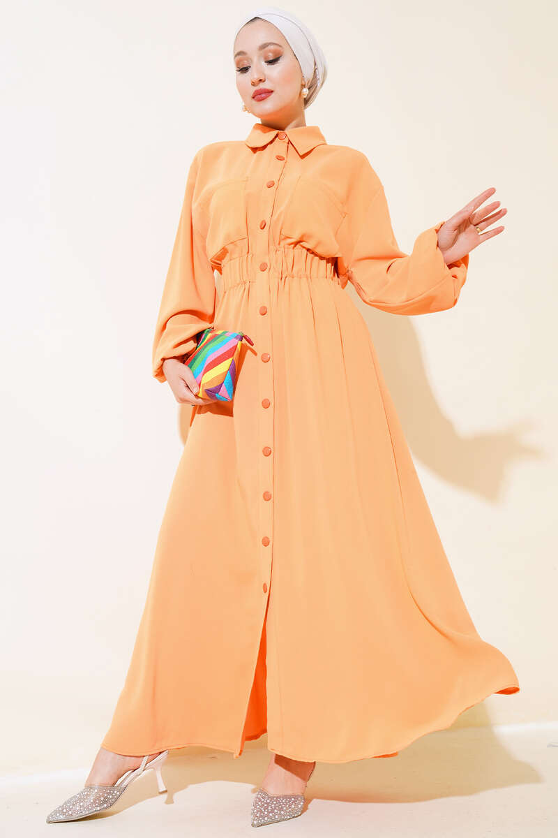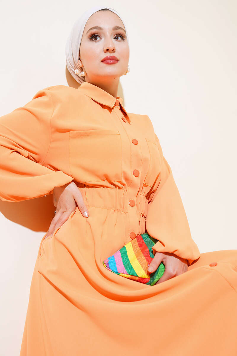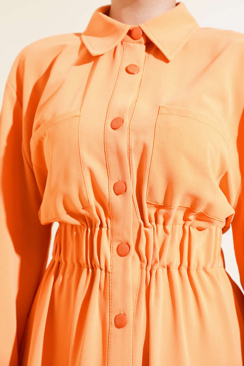 Bel Lastikli Çİft Cepli Elbise Oranj