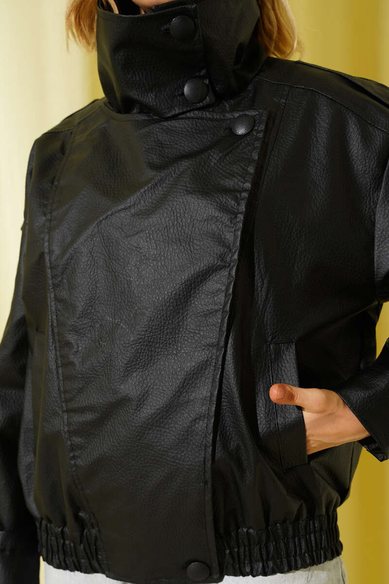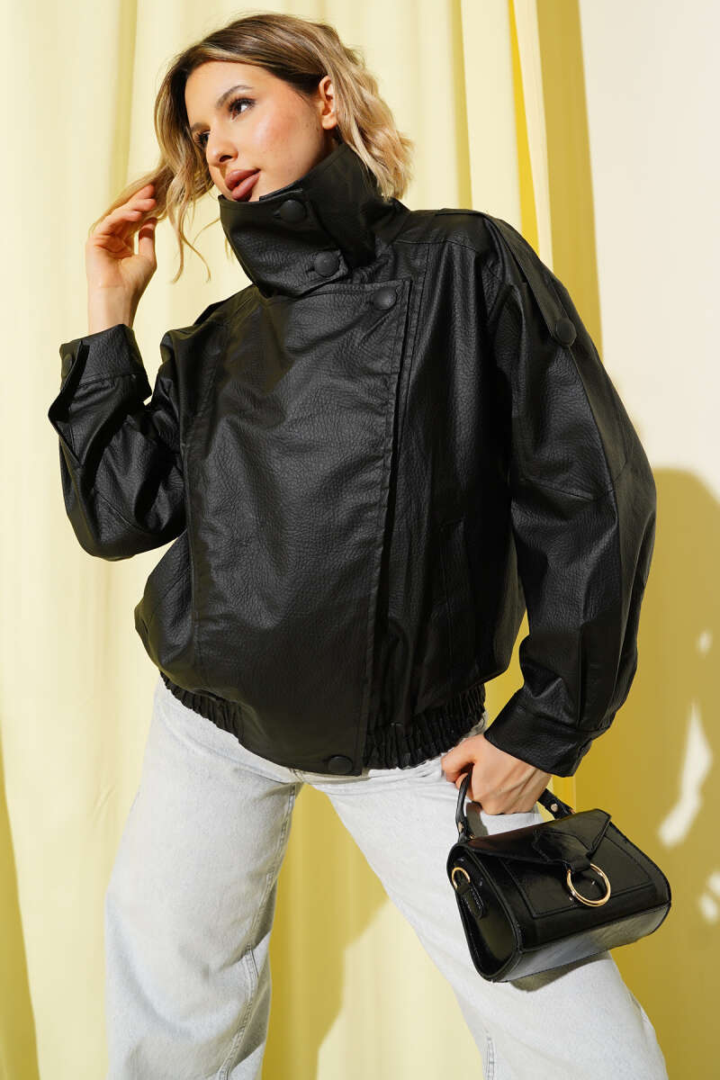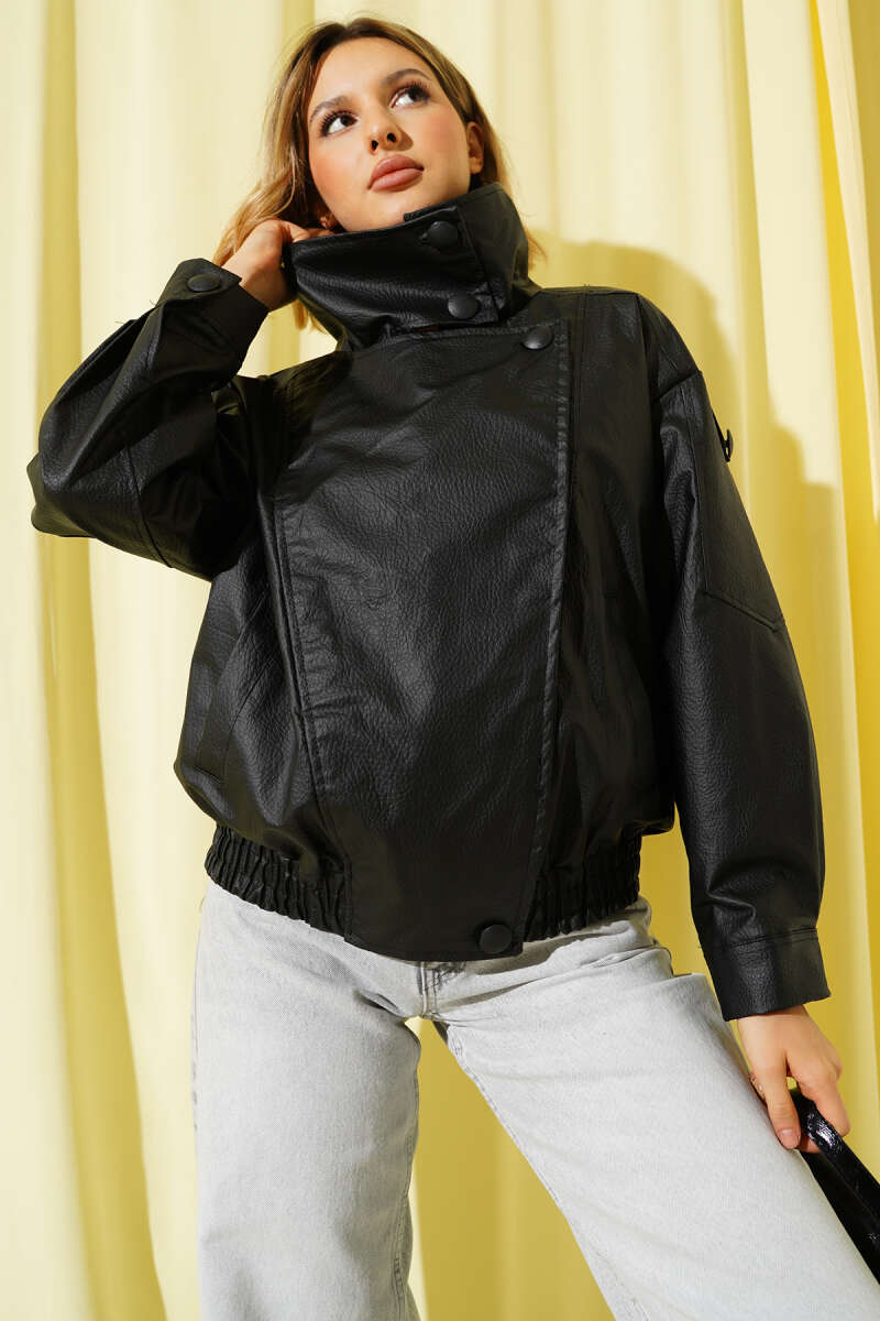 Bel Lastikli Çıtçıtlı Deri Ceket Siyah
