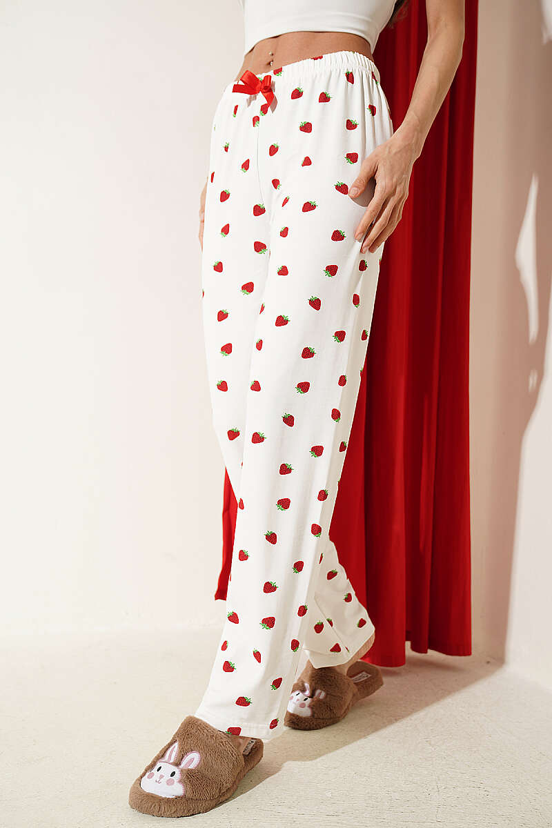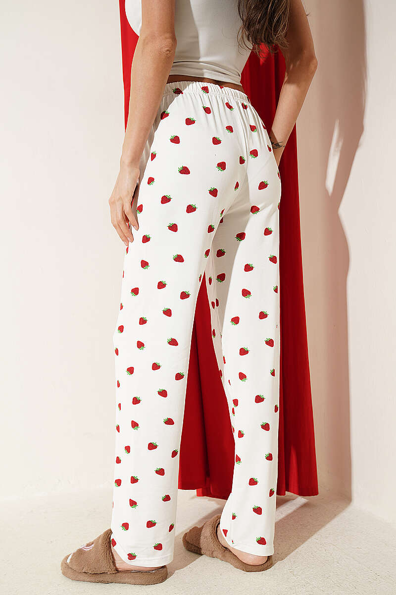 Bel Lastikli Desenli Pijama Altı Beyaz Kırmızı