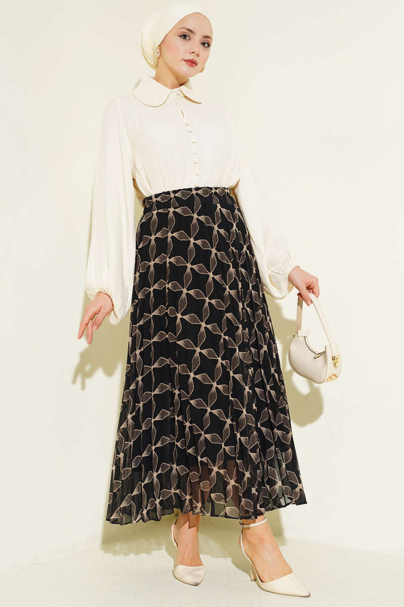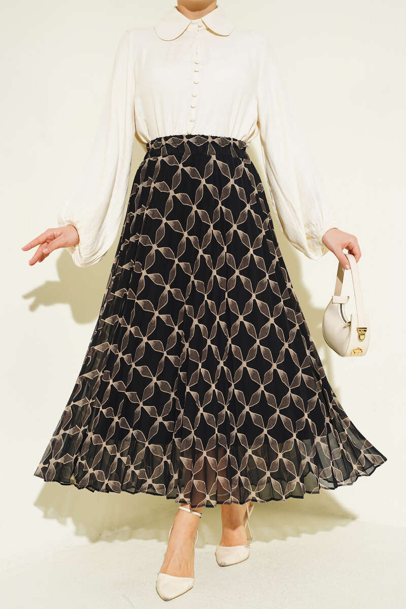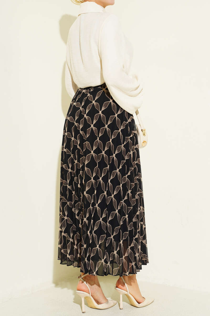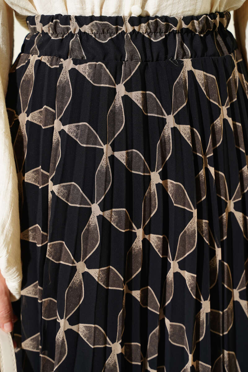 Bel Lastikli Desenli Pileli Etek Siyah