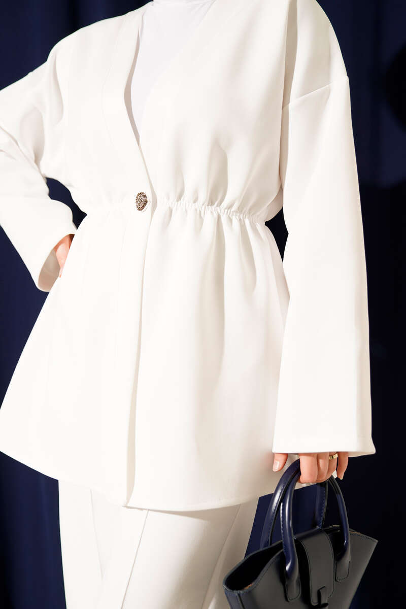 Bel Lastikli Düğme Detaylı İkili Takım Beyaz