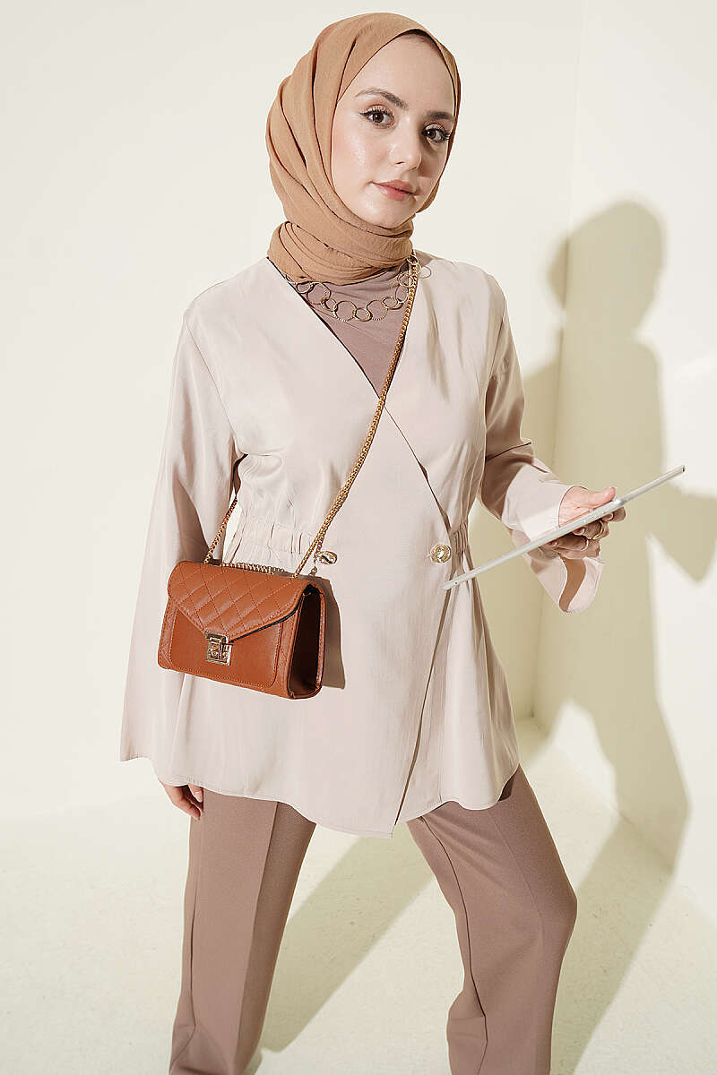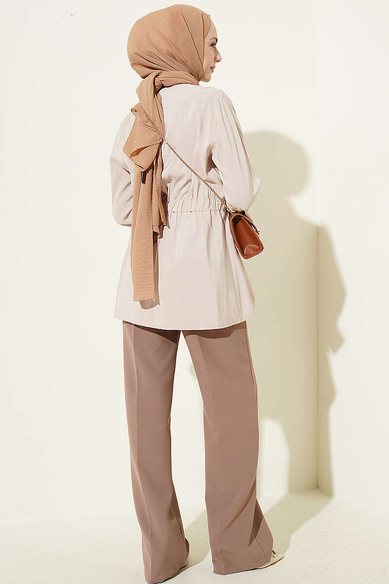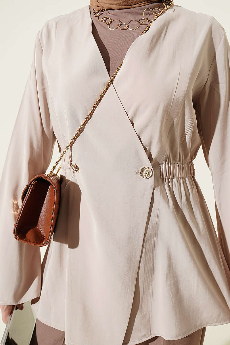 Bel Lastikli Düğmeli Tensel Ceket Bej