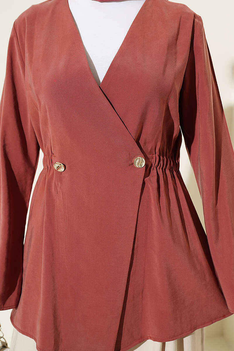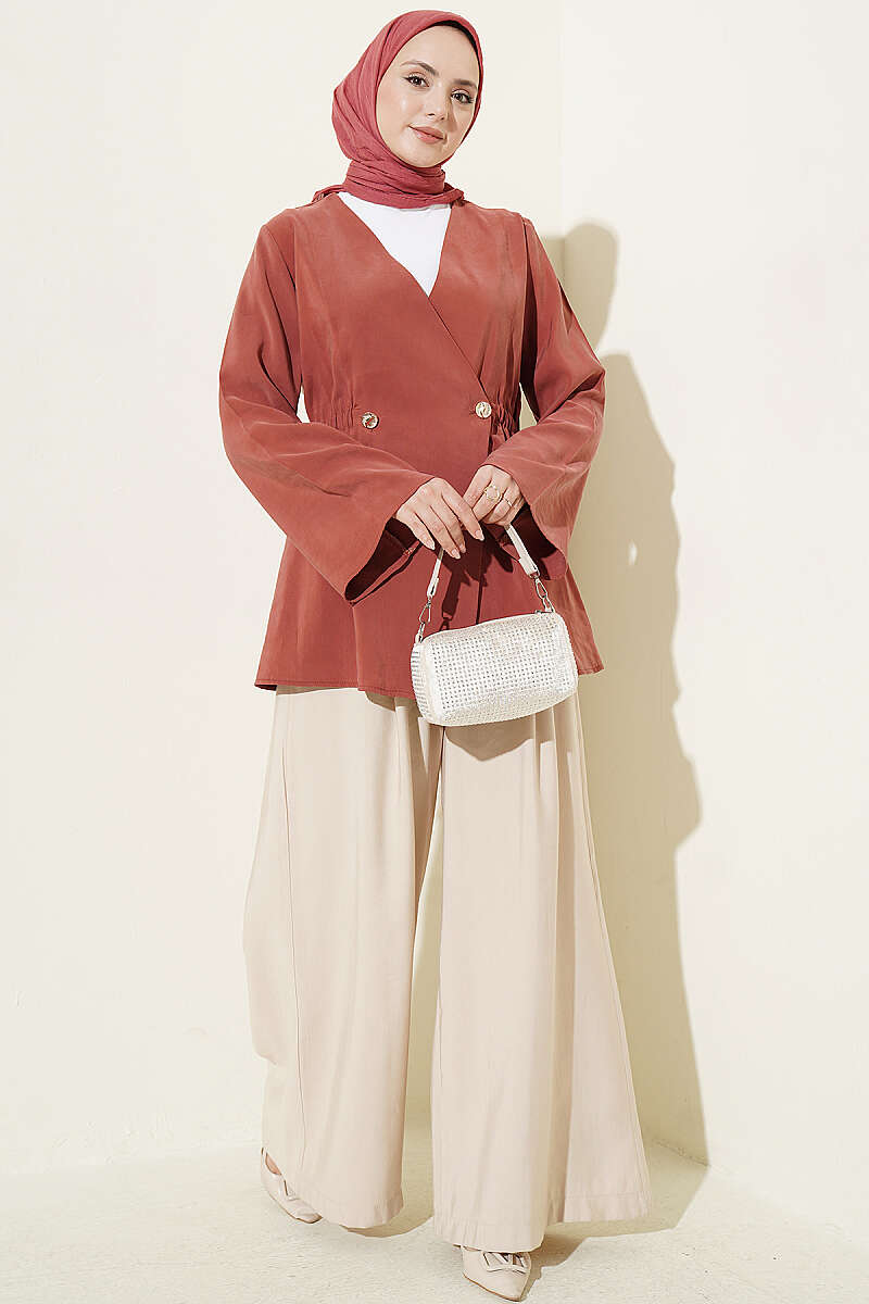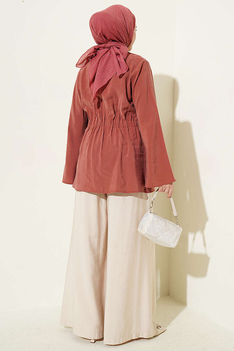 Bel Lastikli Düğmeli Tensel Ceket Kiremit