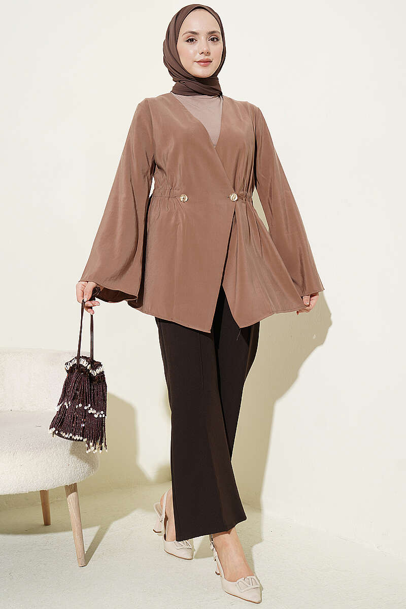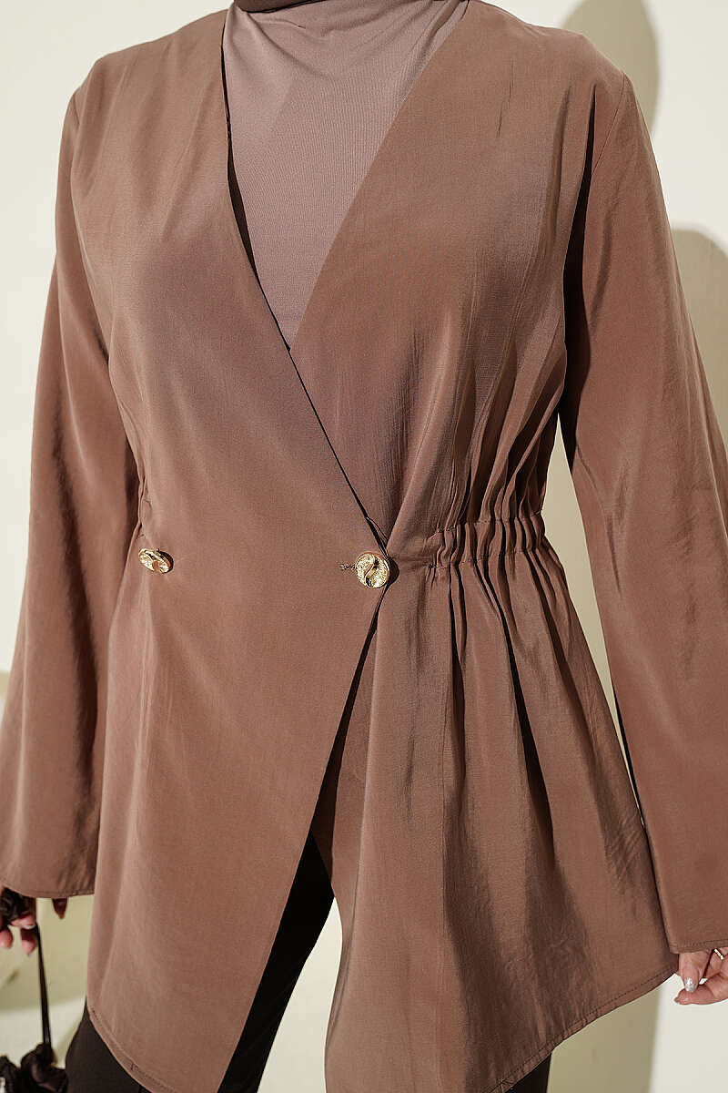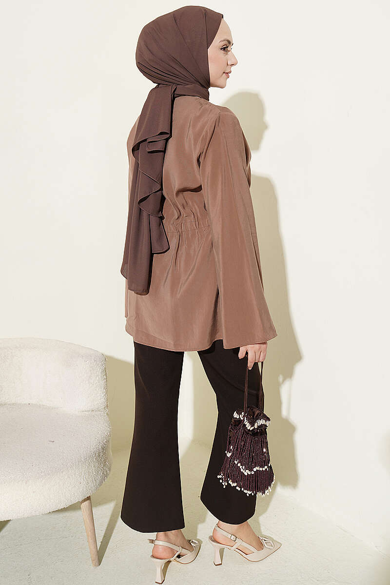 Bel Lastikli Düğmeli Tensel Ceket Latte