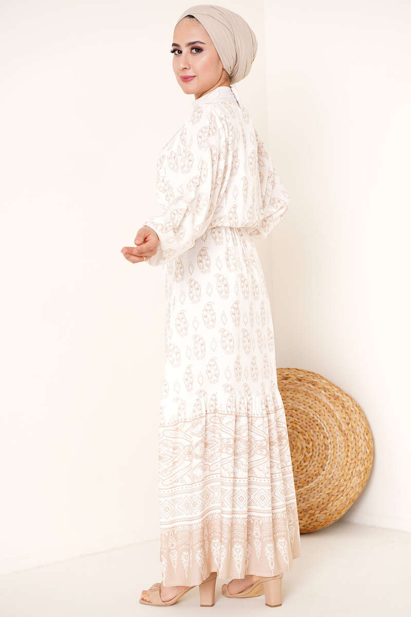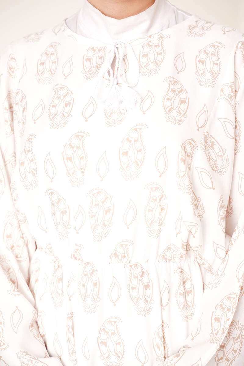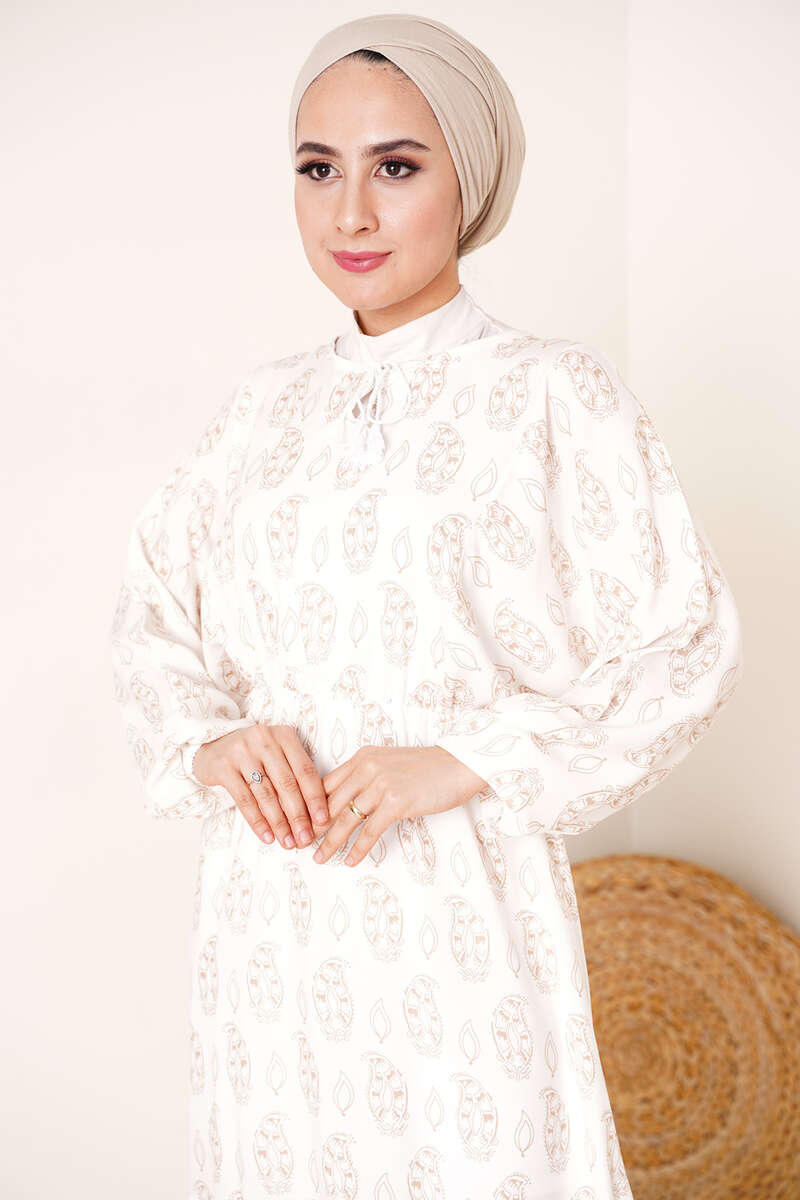 Yeni sezon etnik desenli elbisemiz bel lastiklidir. Yarasa kol olan elbisemiz hafif yapısıyla sezonda favori modeliniz olacaktır. Yakasında bulunan püsküllü bağlama ipi şık duruşunun tamamlayıcı parçası olmuştur.