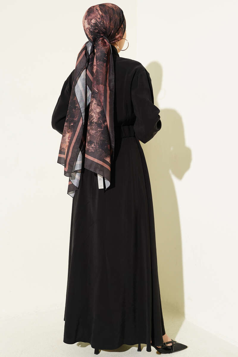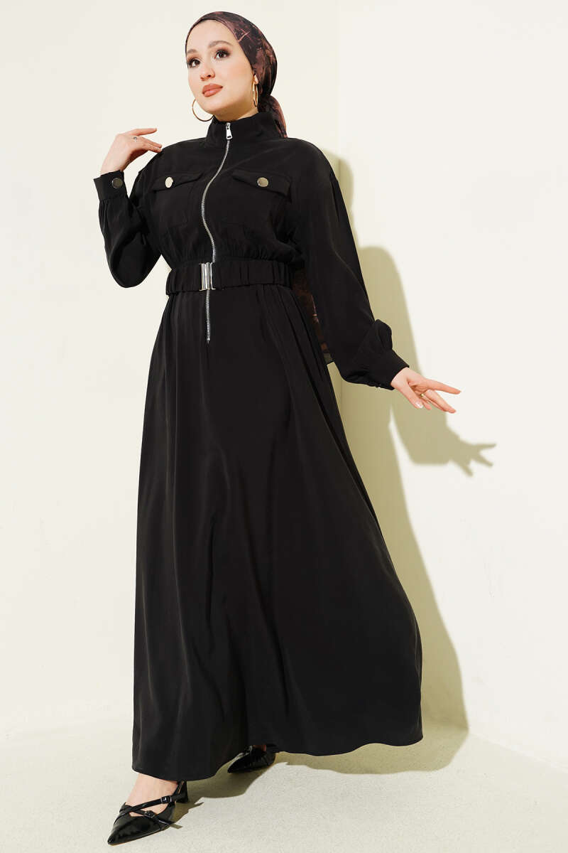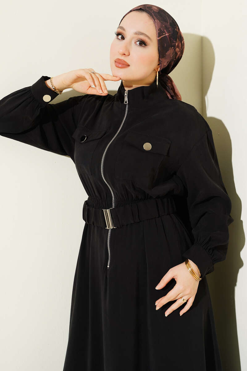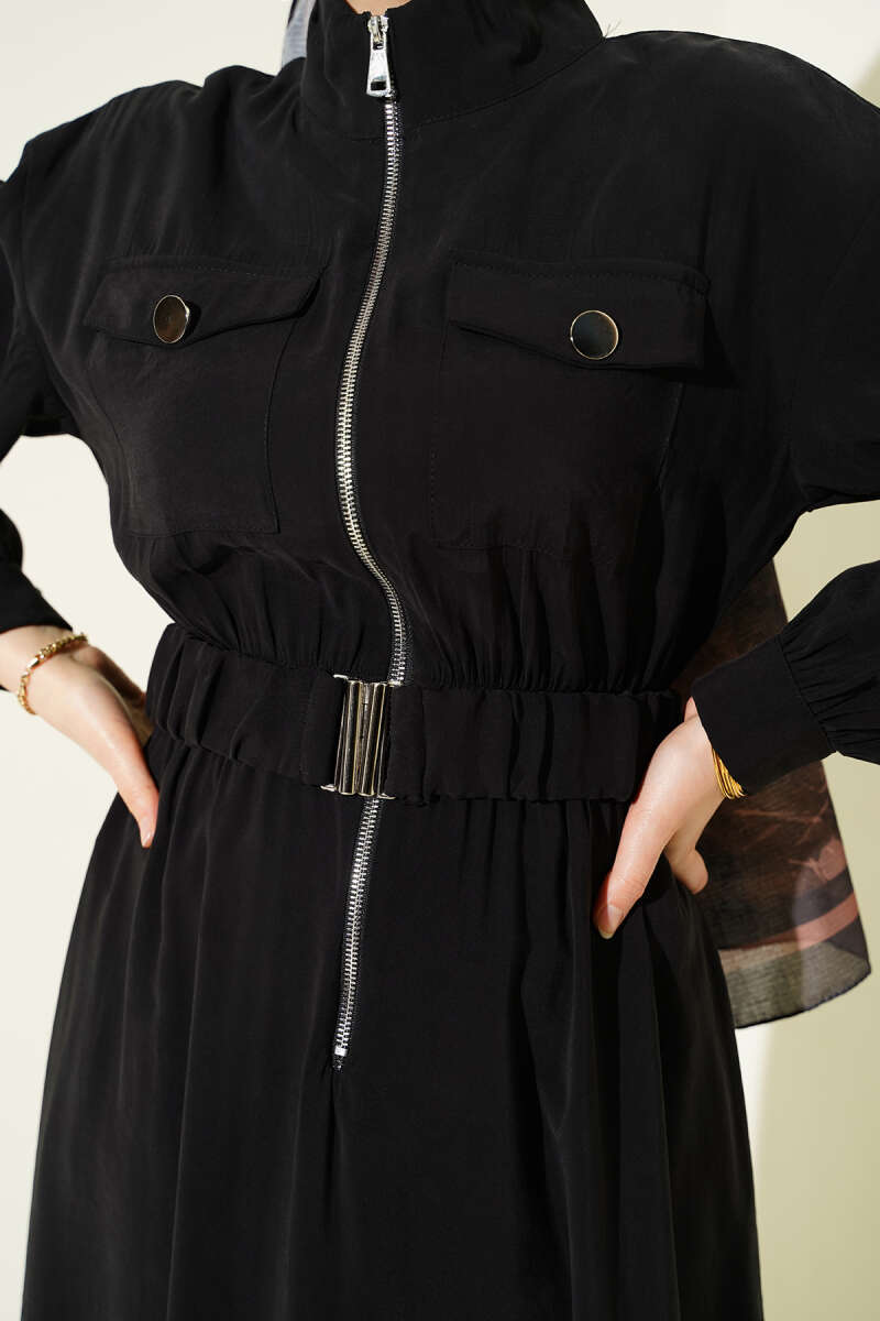 Bel Lastikli Fermuarlı Tensel Elbise Siyah
