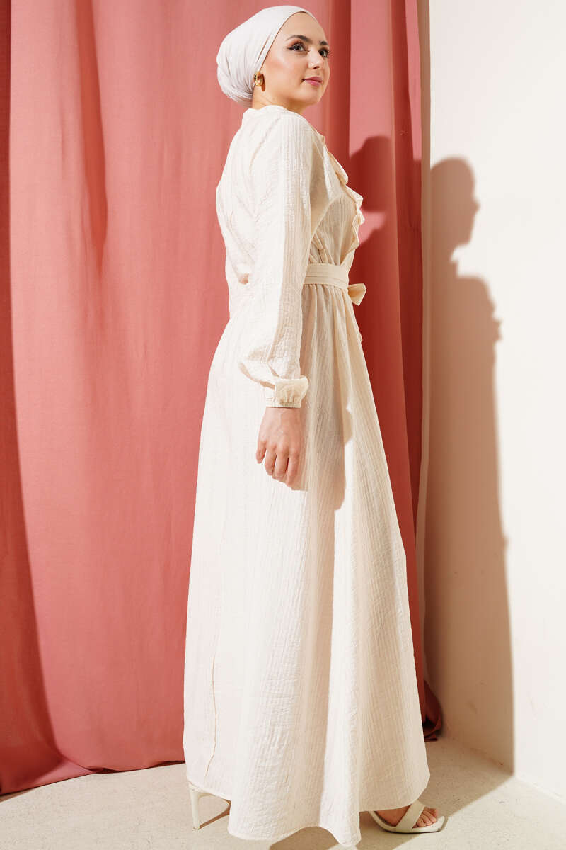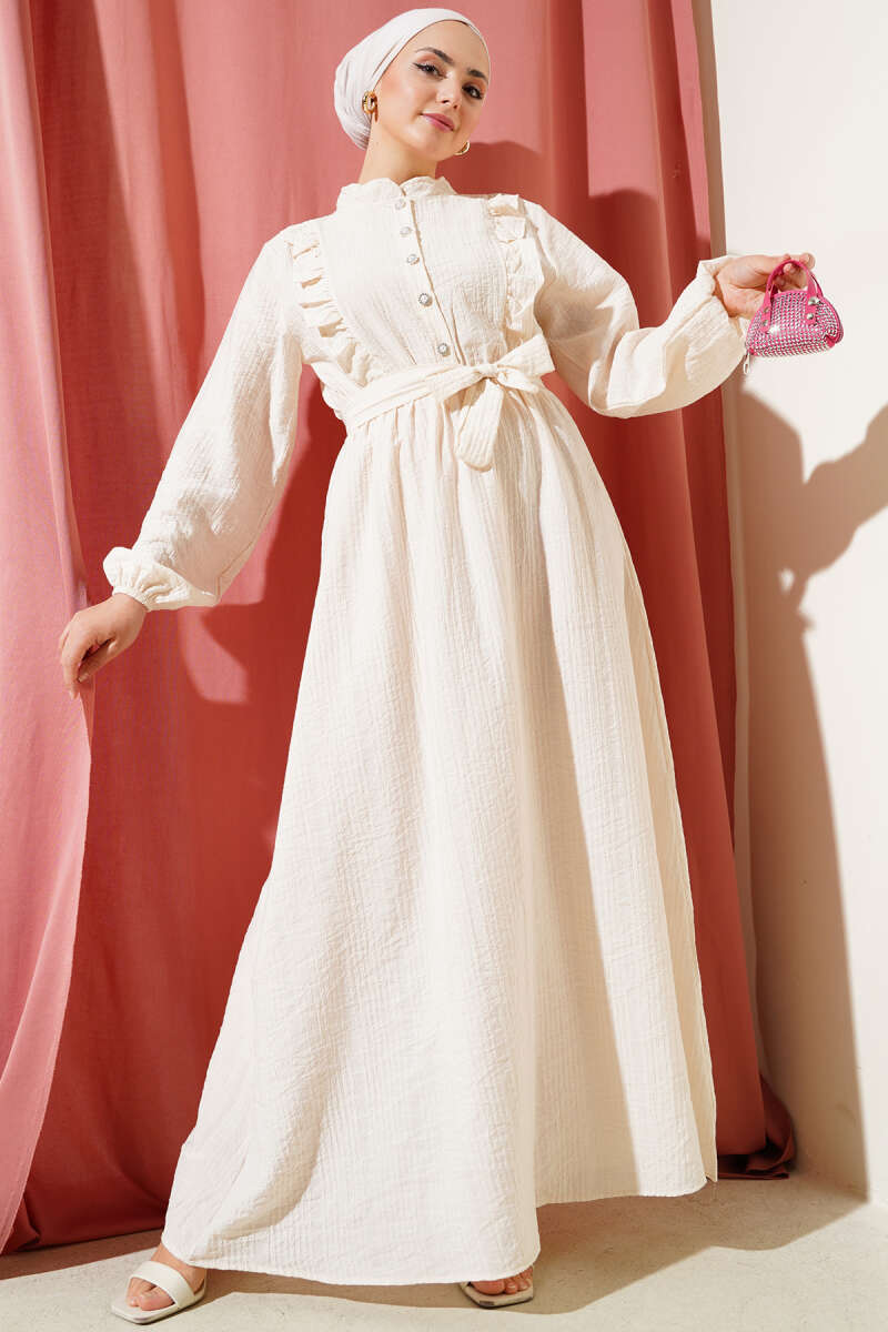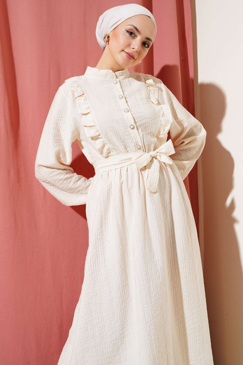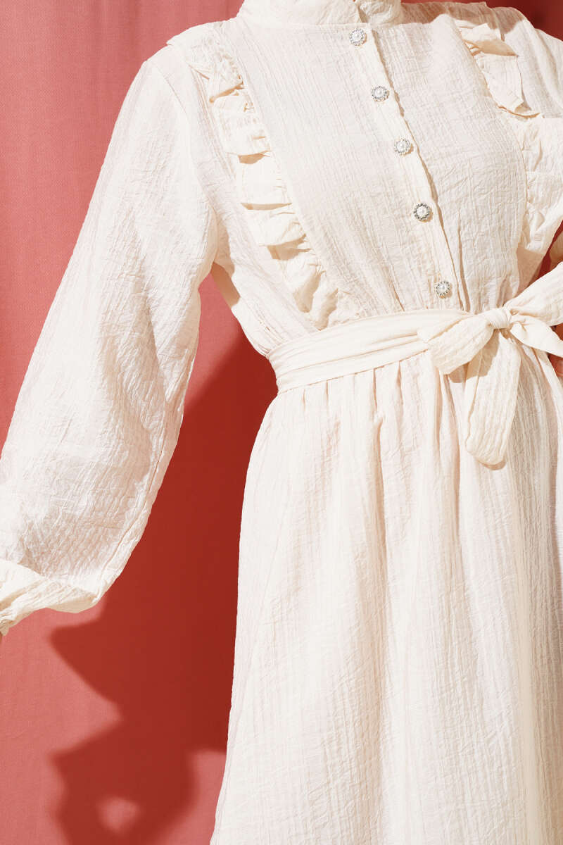 Bel Lastikli Fırfırlı Düğmeli Elbise Bej