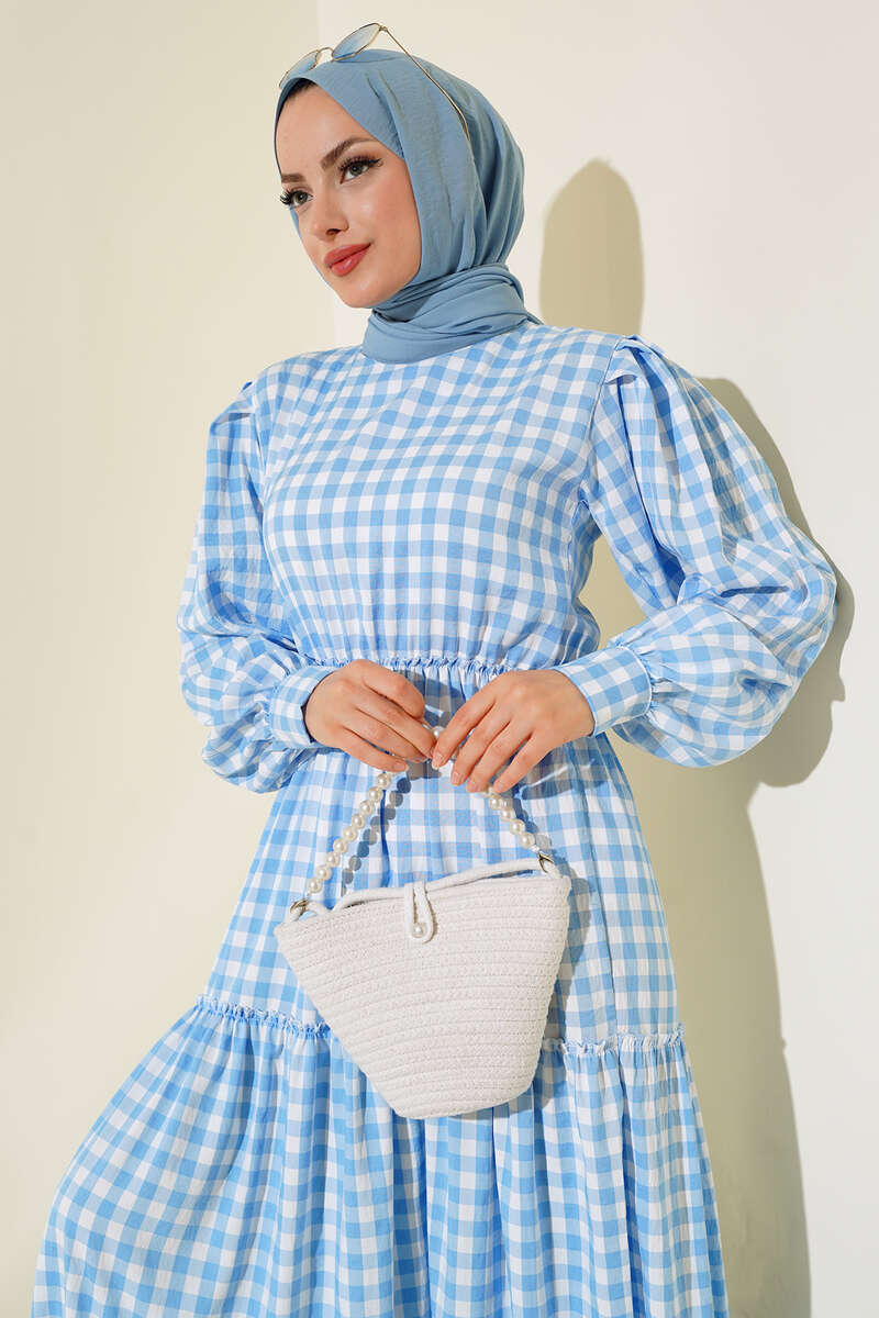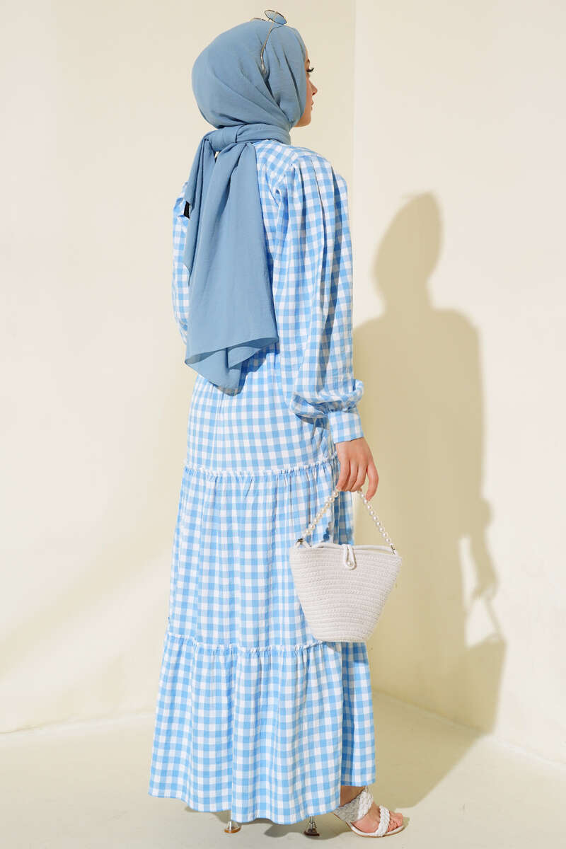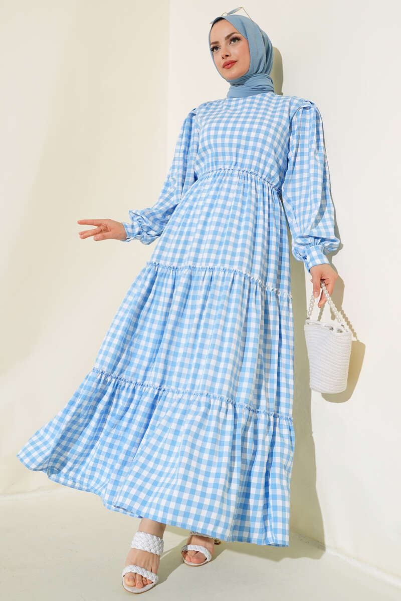 Bel Lastikli Kare Desenli Kat Elbise Mavi