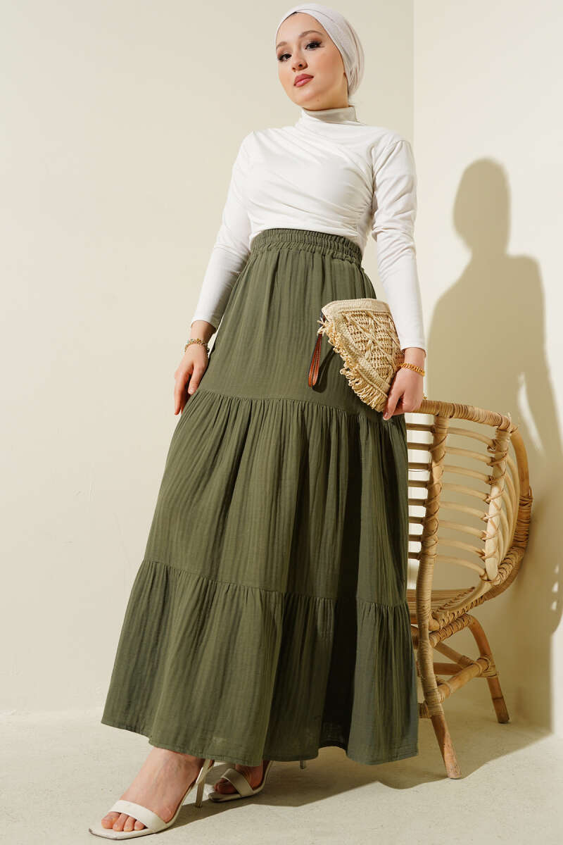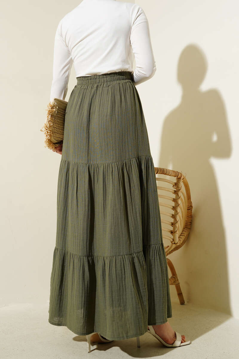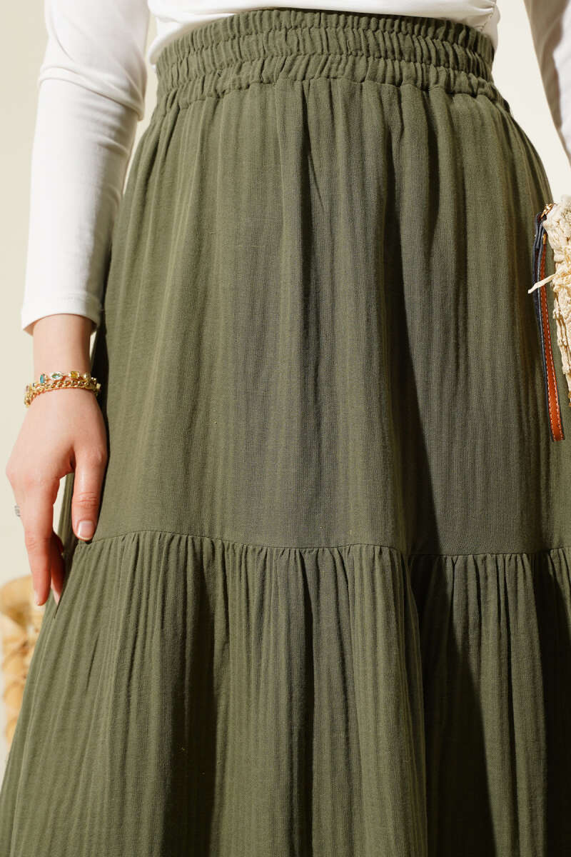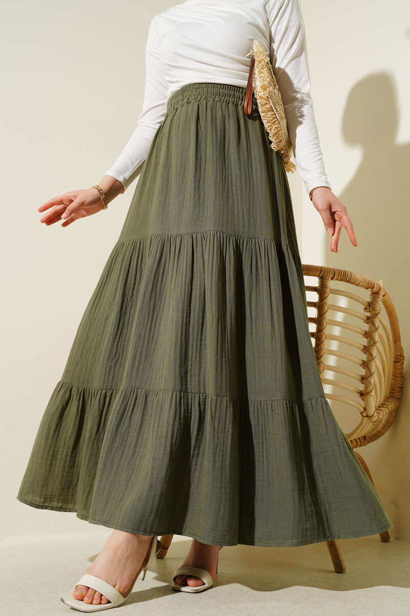 Ekose Desenli Düğmeli Kloş Etek Haki