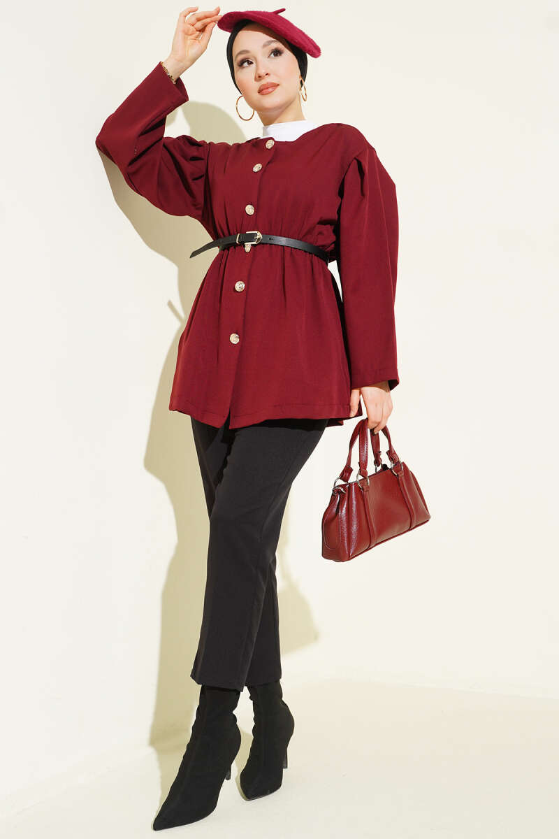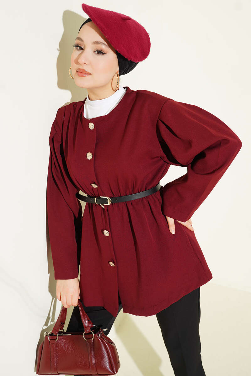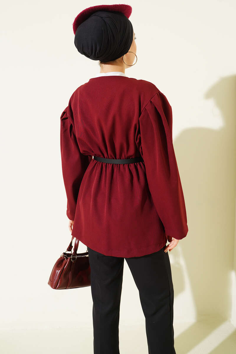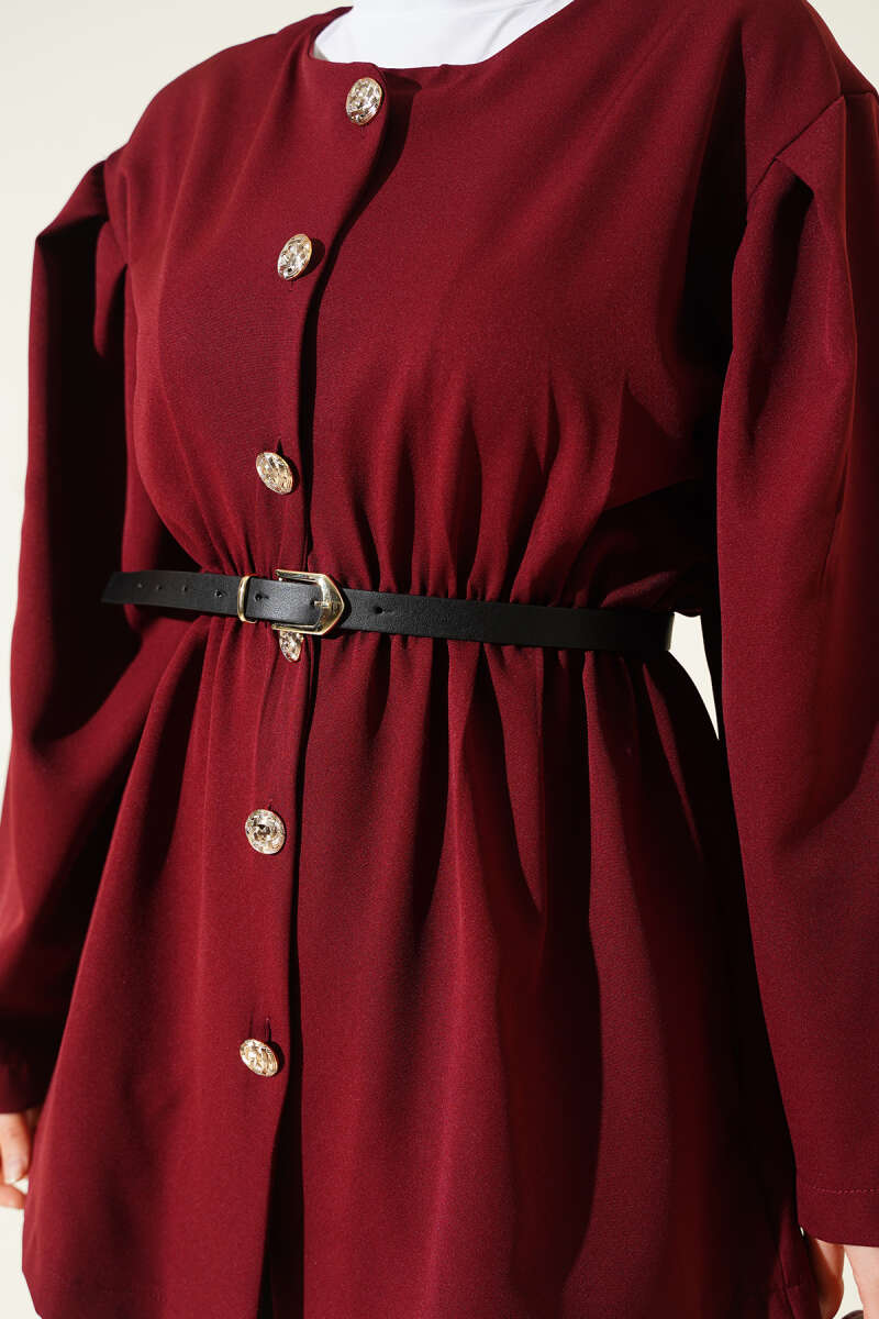 Kalp Düğmeli Bilek Kürklü Triko Hırka Bordo