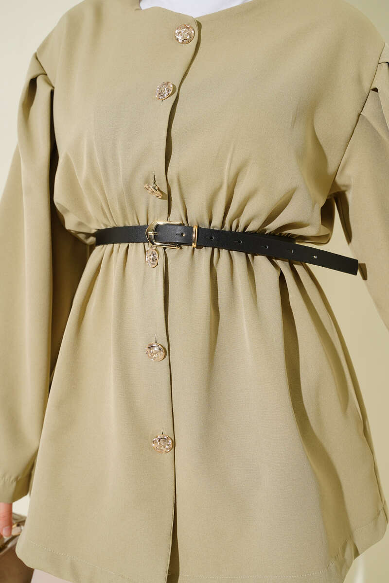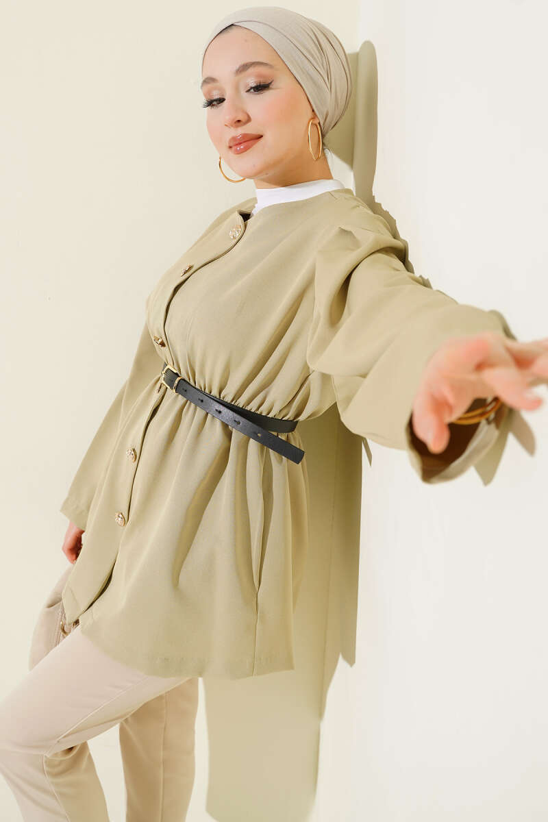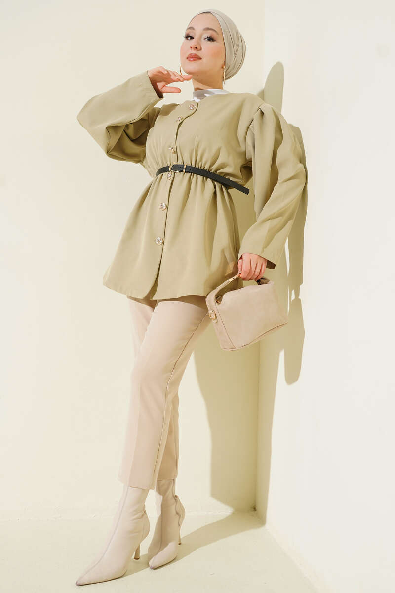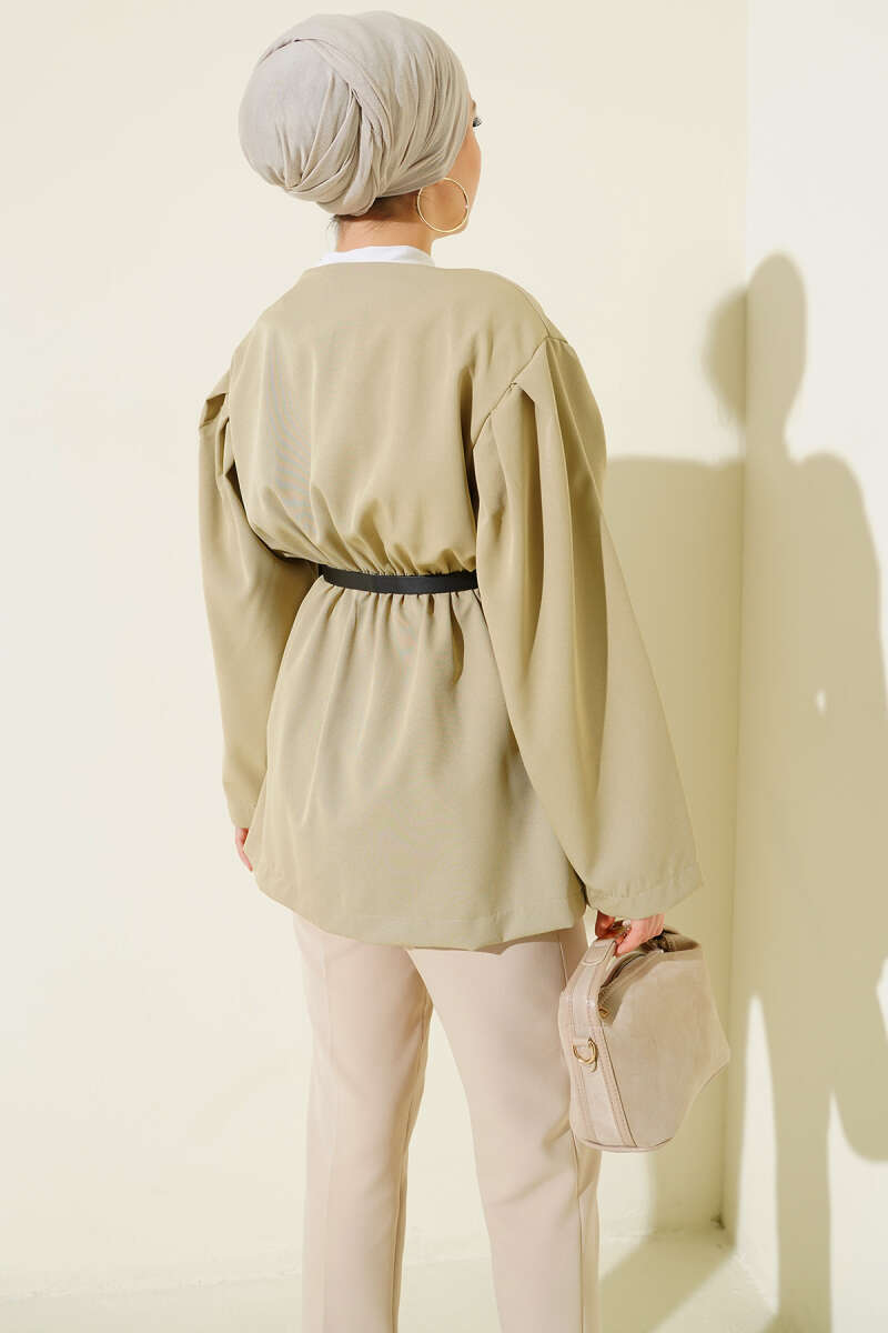 Bel Lastikli Kemerli Dabıl Ceket Bej