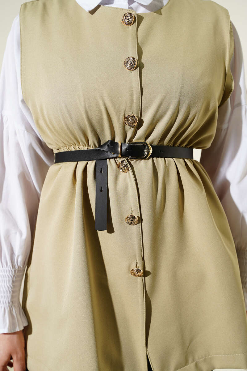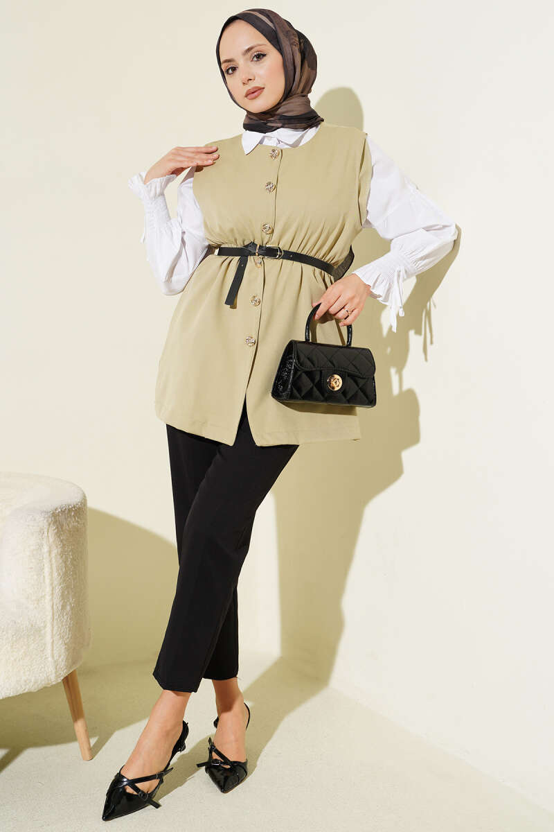 Bel Lastikli Kemerli Dabıl Yelek Bej