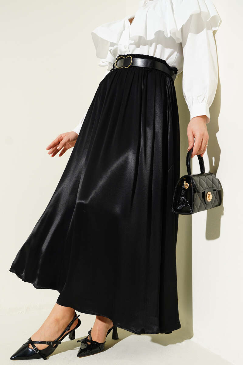 Bel Lastikli Dantelli Kloş Etek Siyah