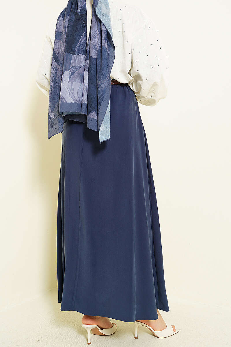 Beli Lastikli Düz Saten Etek Lacivert