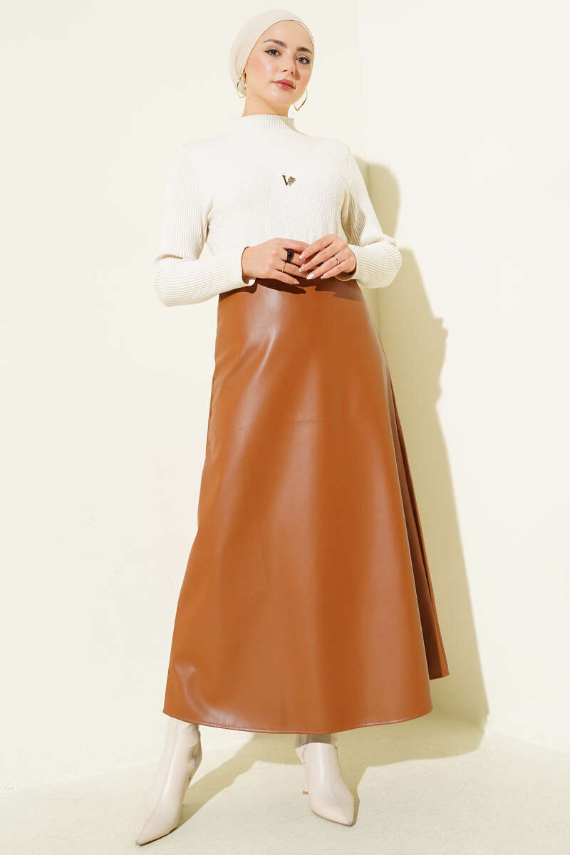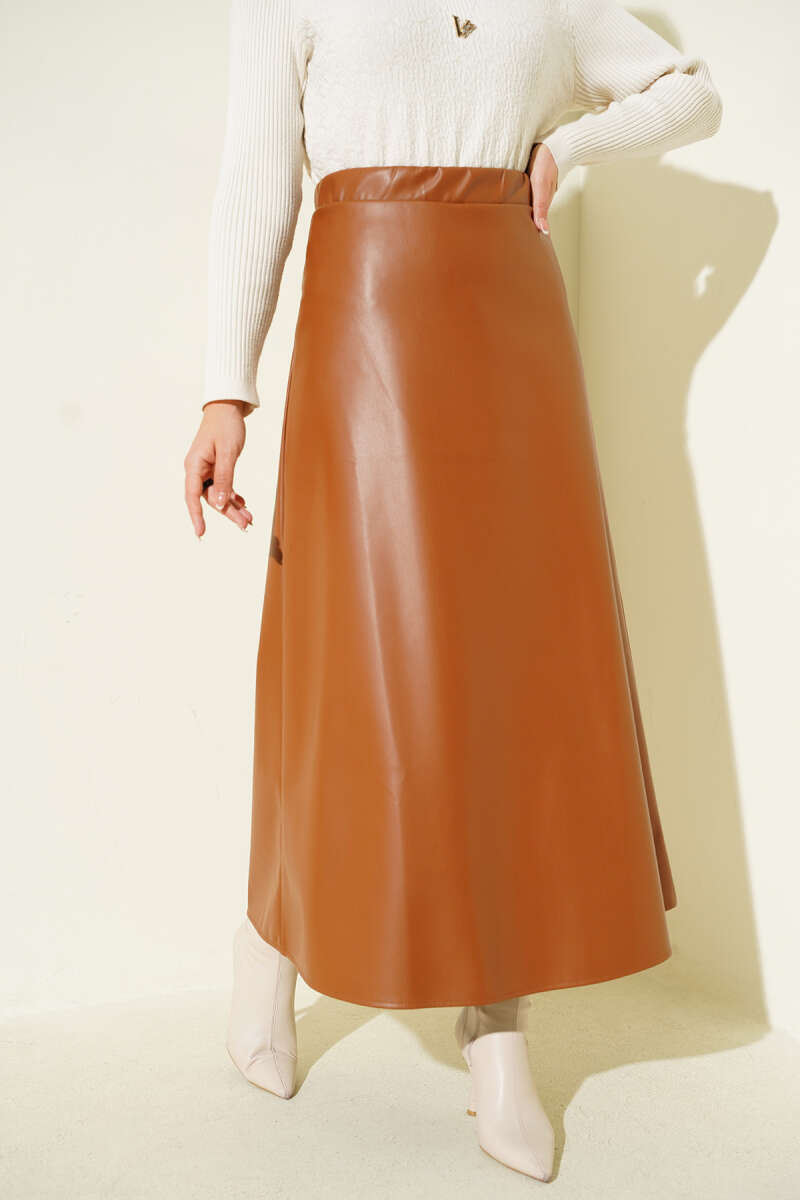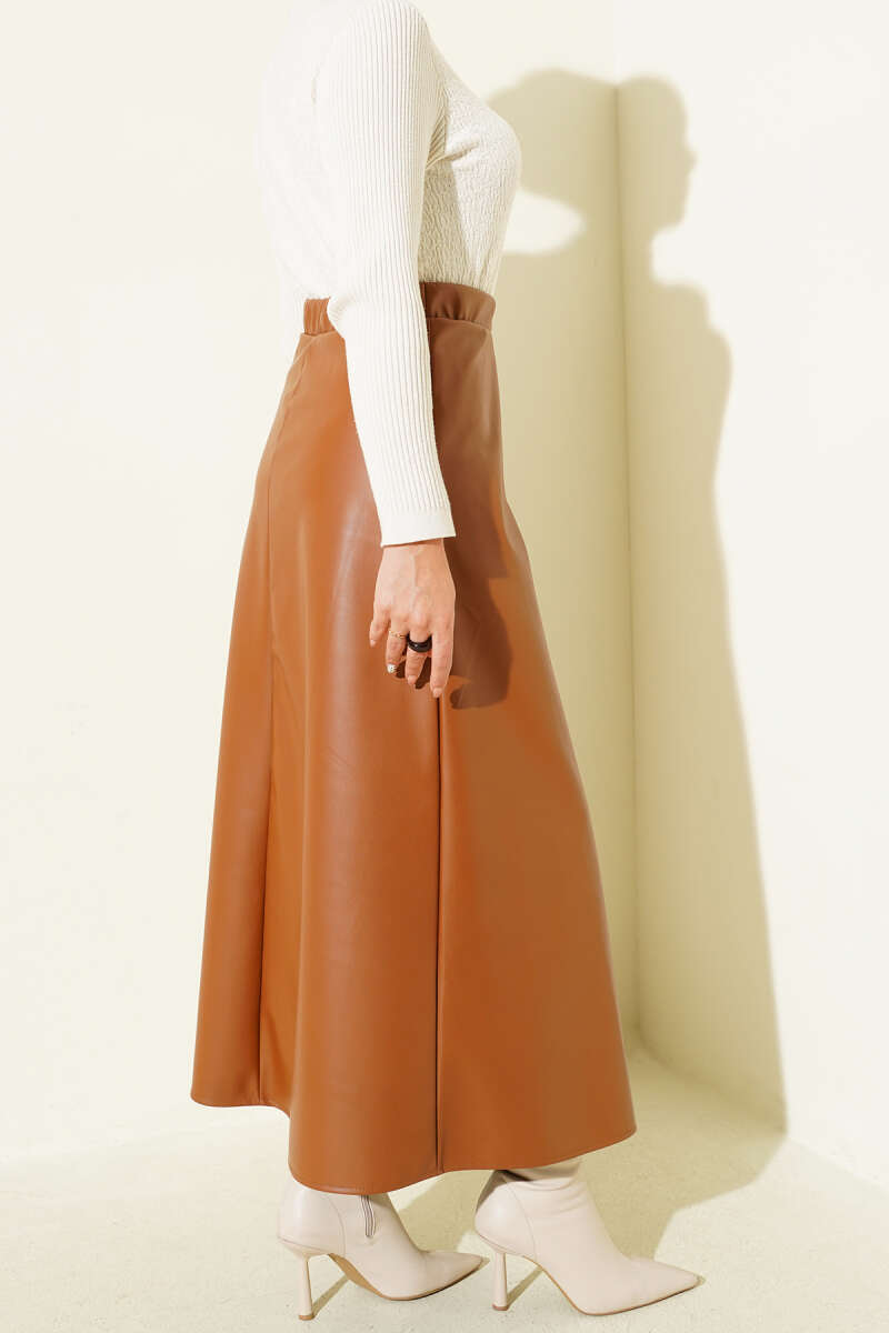 Bel Lastikli Kloş Basic Deri Etek Bej