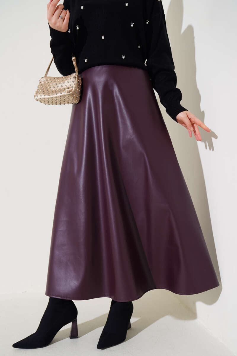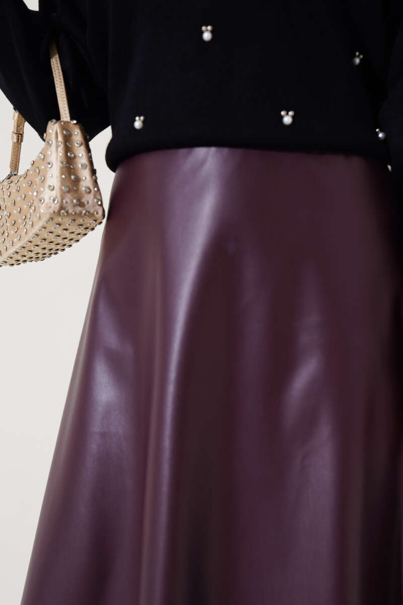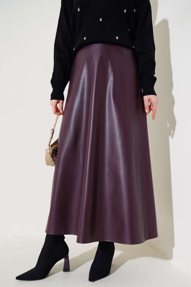 Bel Lastikli Kloş Deri Etek Mürdüm