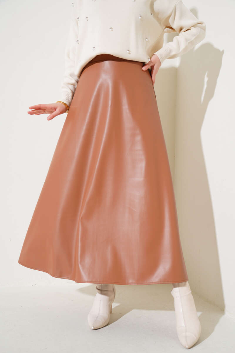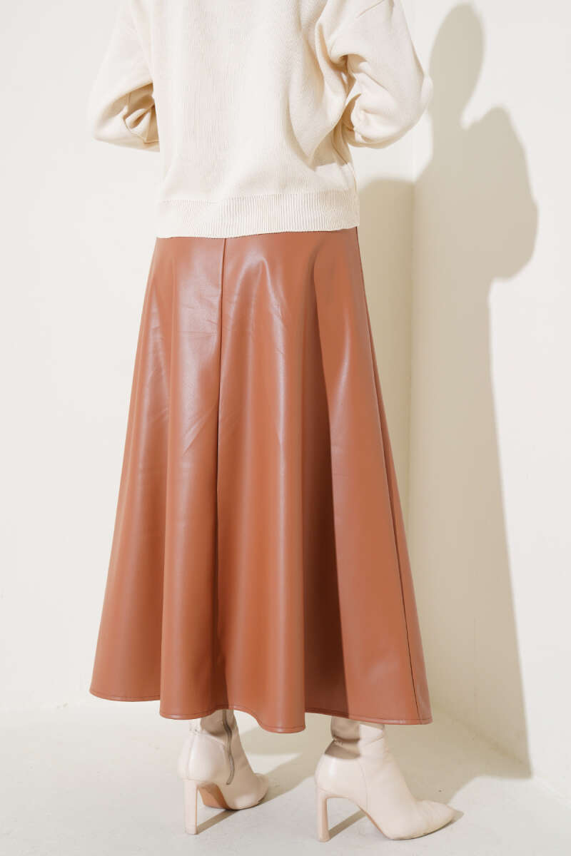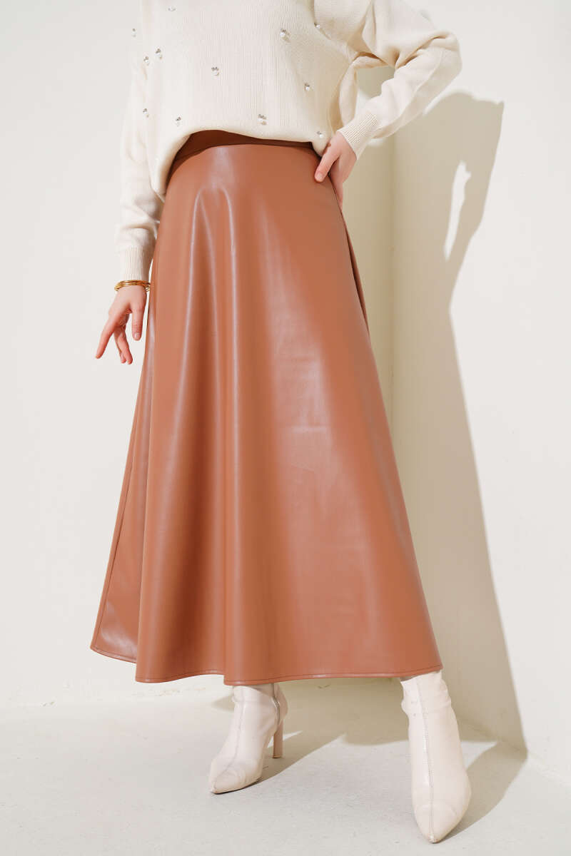 Bel Lastikli Kloş Deri Etek Taba