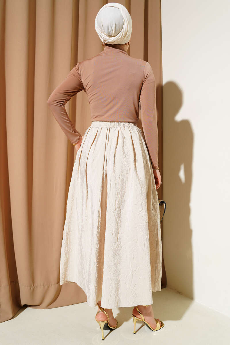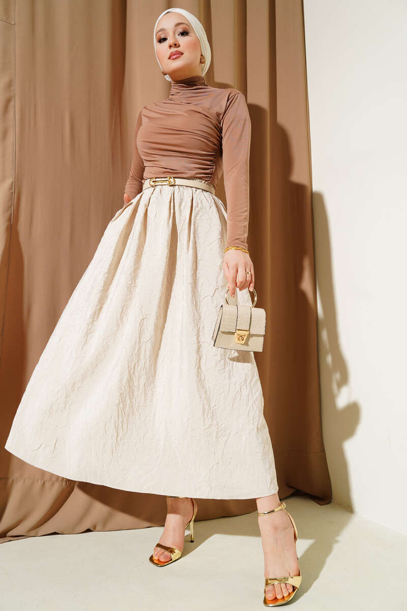 Beli Lastik Detaylı Kloş Scuba Etek Kahve