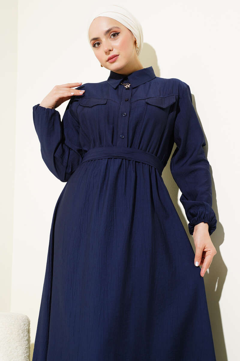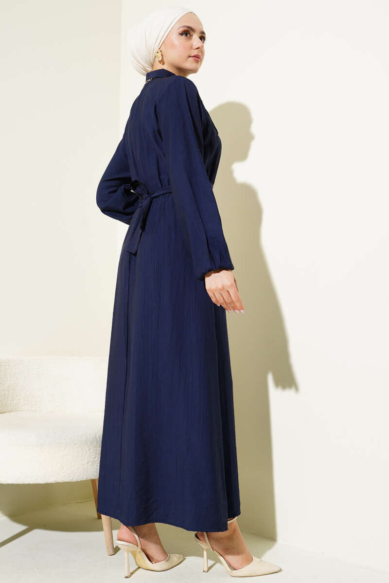 Metal Düğme Süslemeli Bağcıklı Elbise Siyah