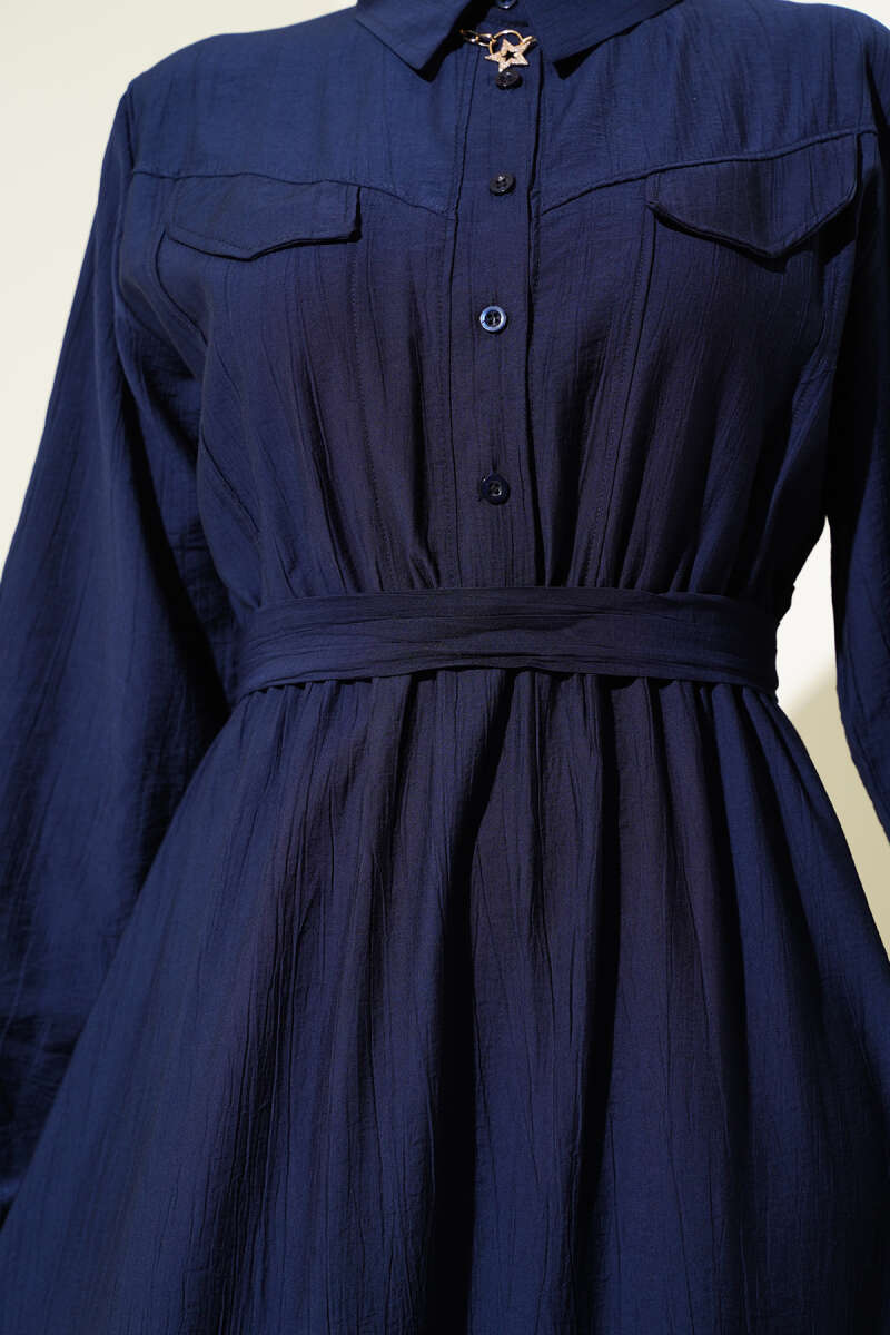 Balıkçı Yaka İp Kuşaklı Triko Elbise Lacivert