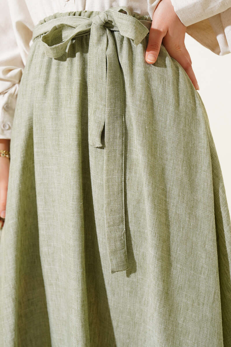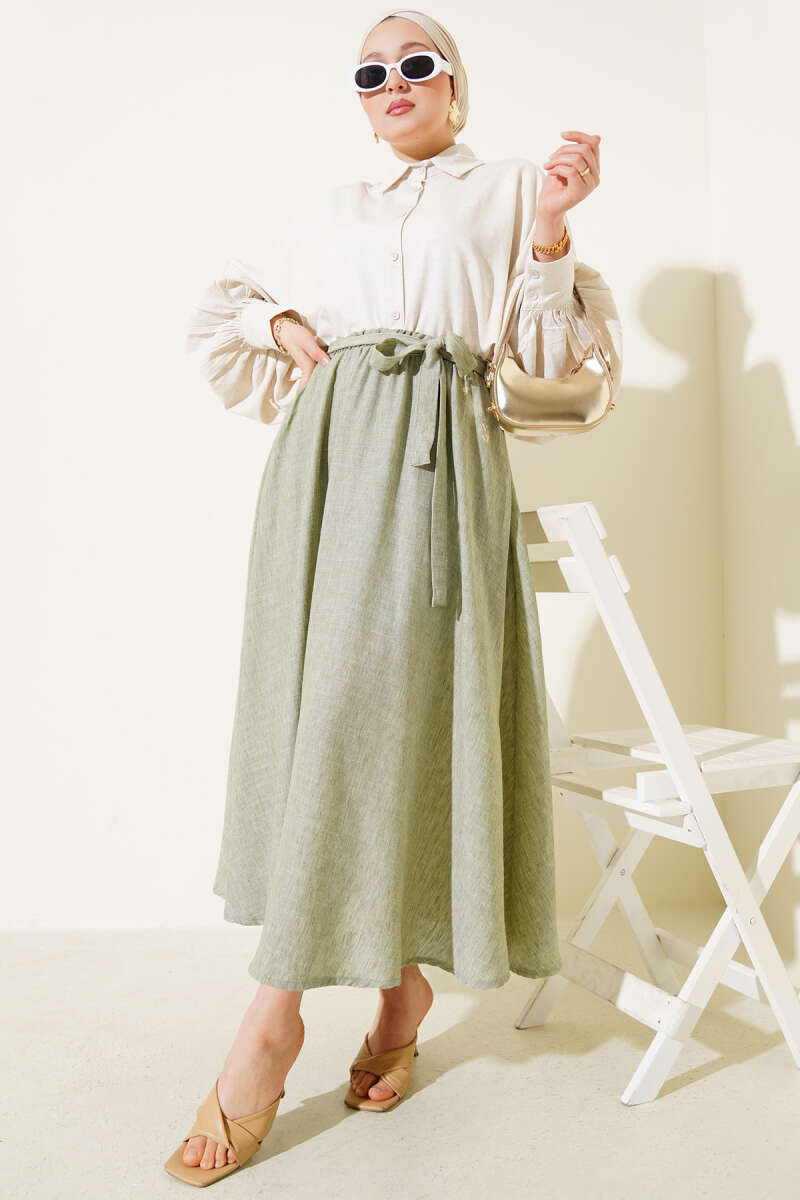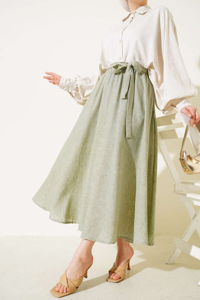 Kemer Aksesuarlı Ekoseli Etek Haki