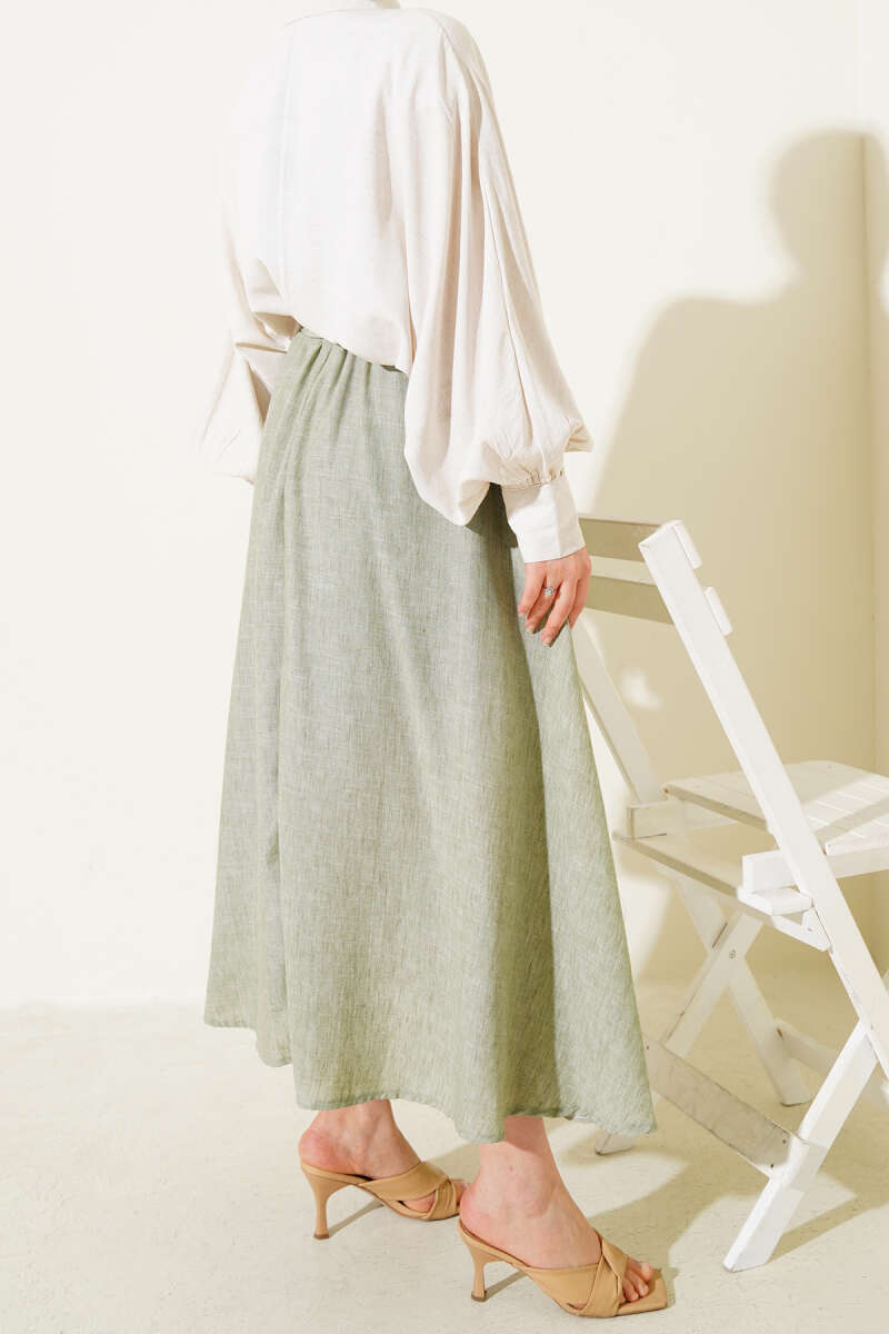 Ekose Desenli Düğmeli Kloş Etek Haki