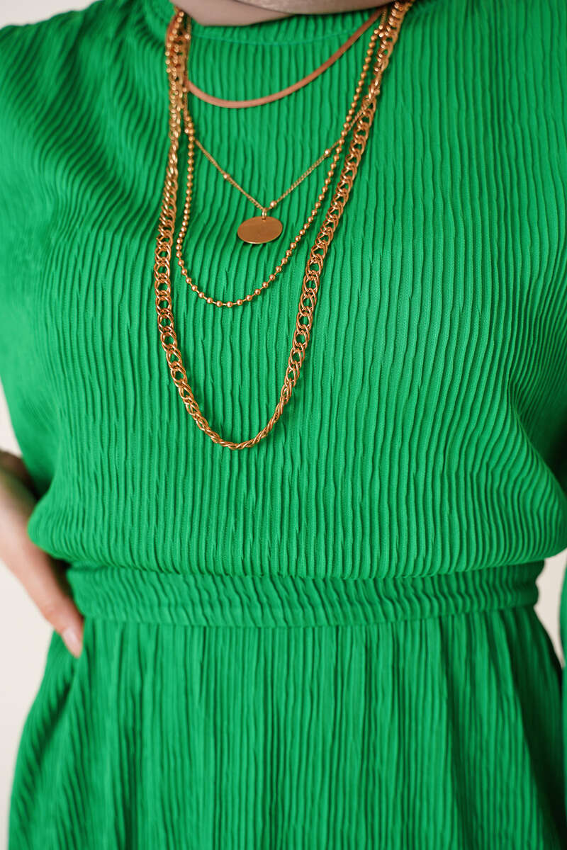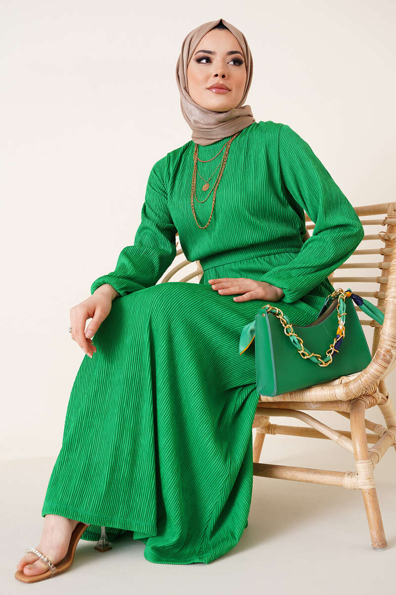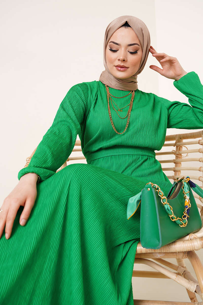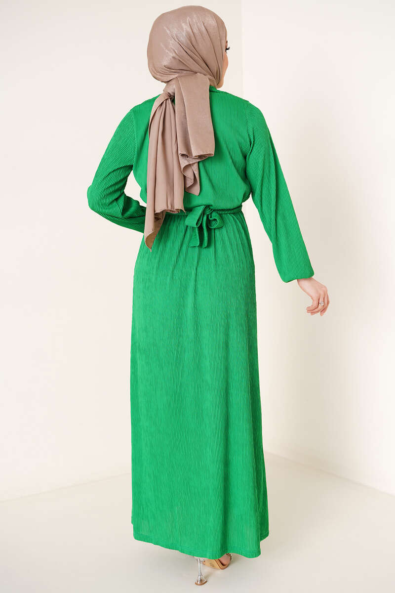 Yeni sezon piliseli elbisemiz bel lastiklidir. Belinde lastiğe eşlik eden kuşağı iki adet kemer köprüsüyle tamamlanmaktadır. Oval yaka olan elbisemizin bilekleri lastiklidir.