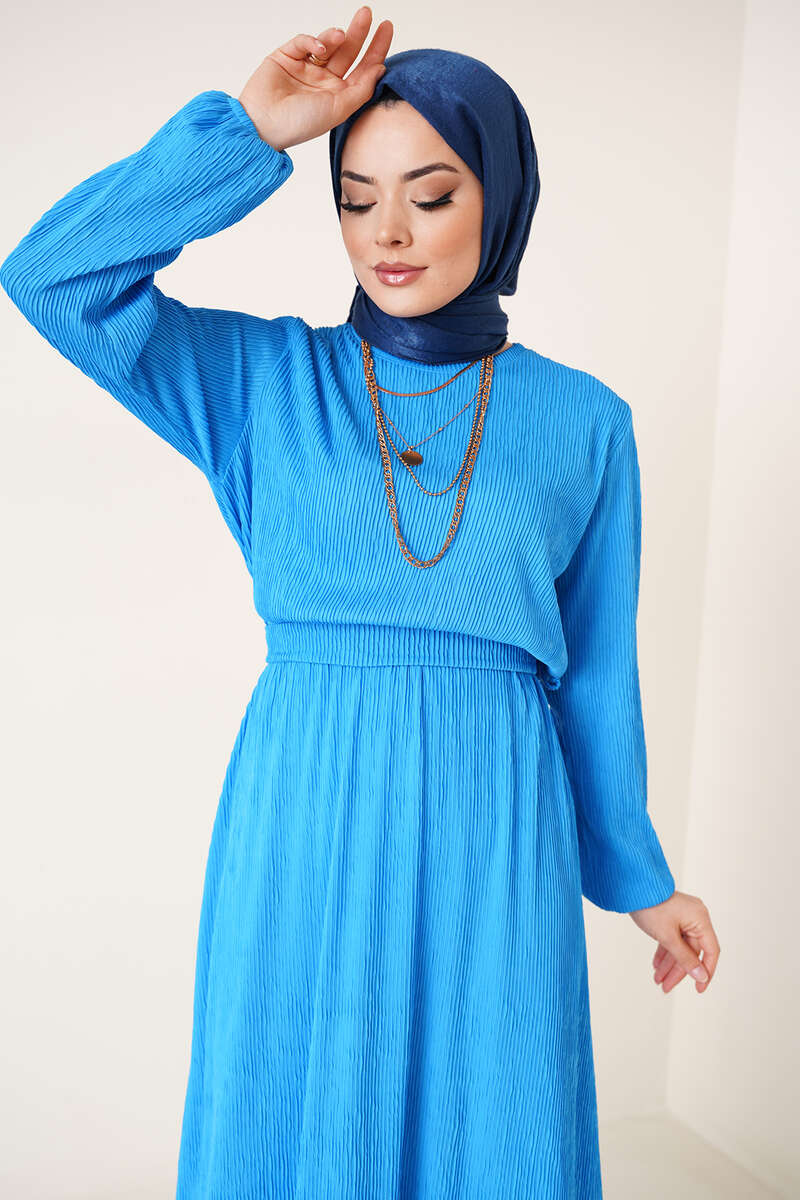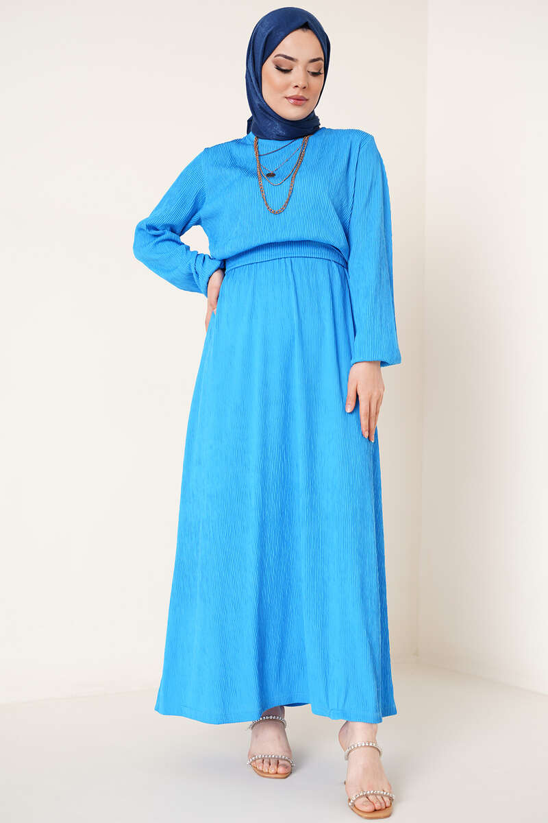 Yeni sezon piliseli elbisemiz bel lastiklidir. Belinde lastiğe eşlik eden kuşağı iki adet kemer köprüsüyle tamamlanmaktadır. Oval yaka olan elbisemizin bilekleri lastiklidir.