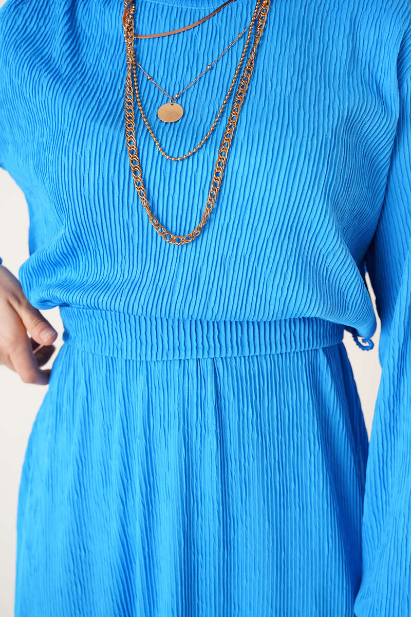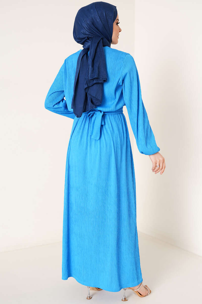 Bel Lastikli Kuşaklı Piliseli Elbise İndigo