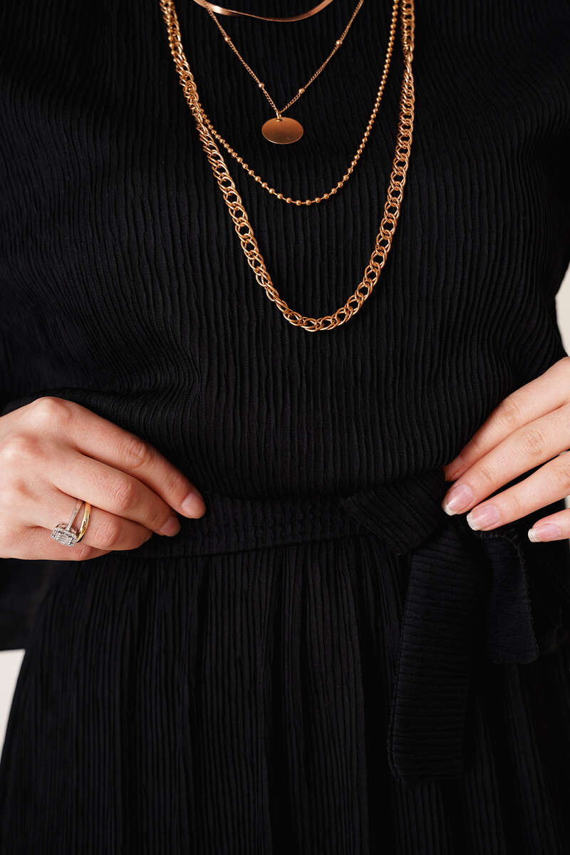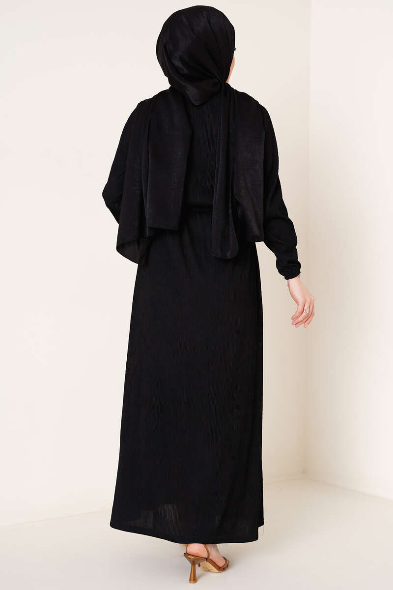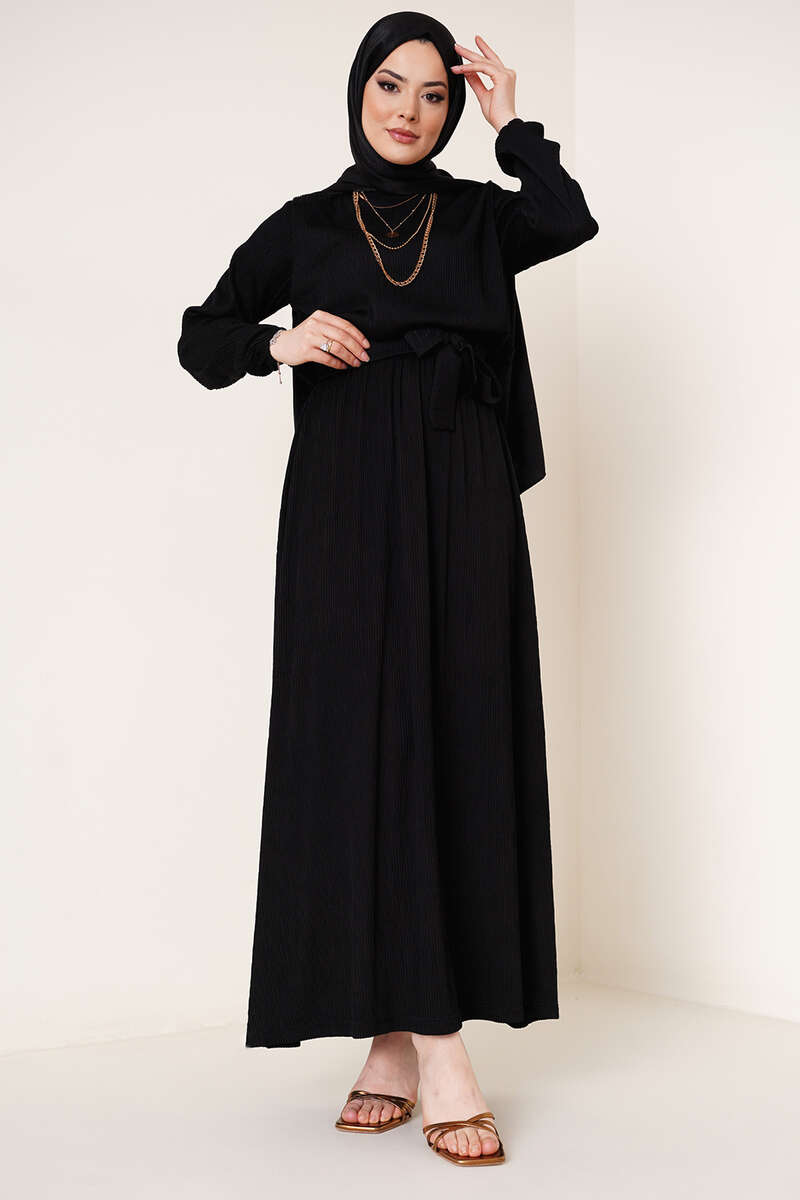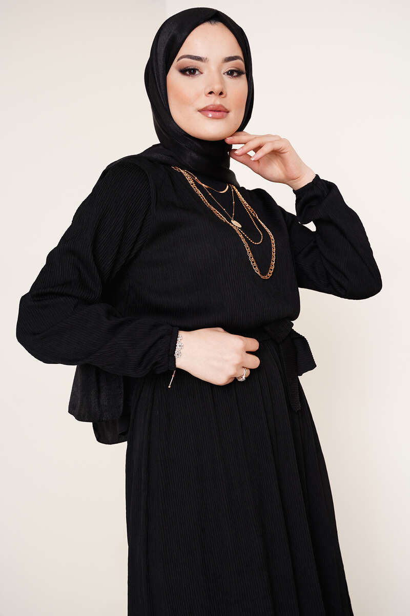 Bel Lastikli Kuşaklı Piliseli Elbise Siyah