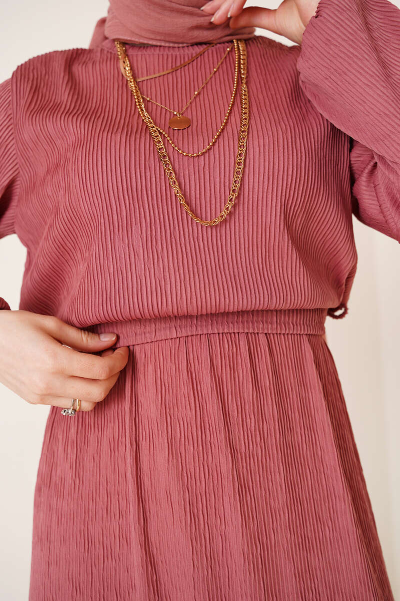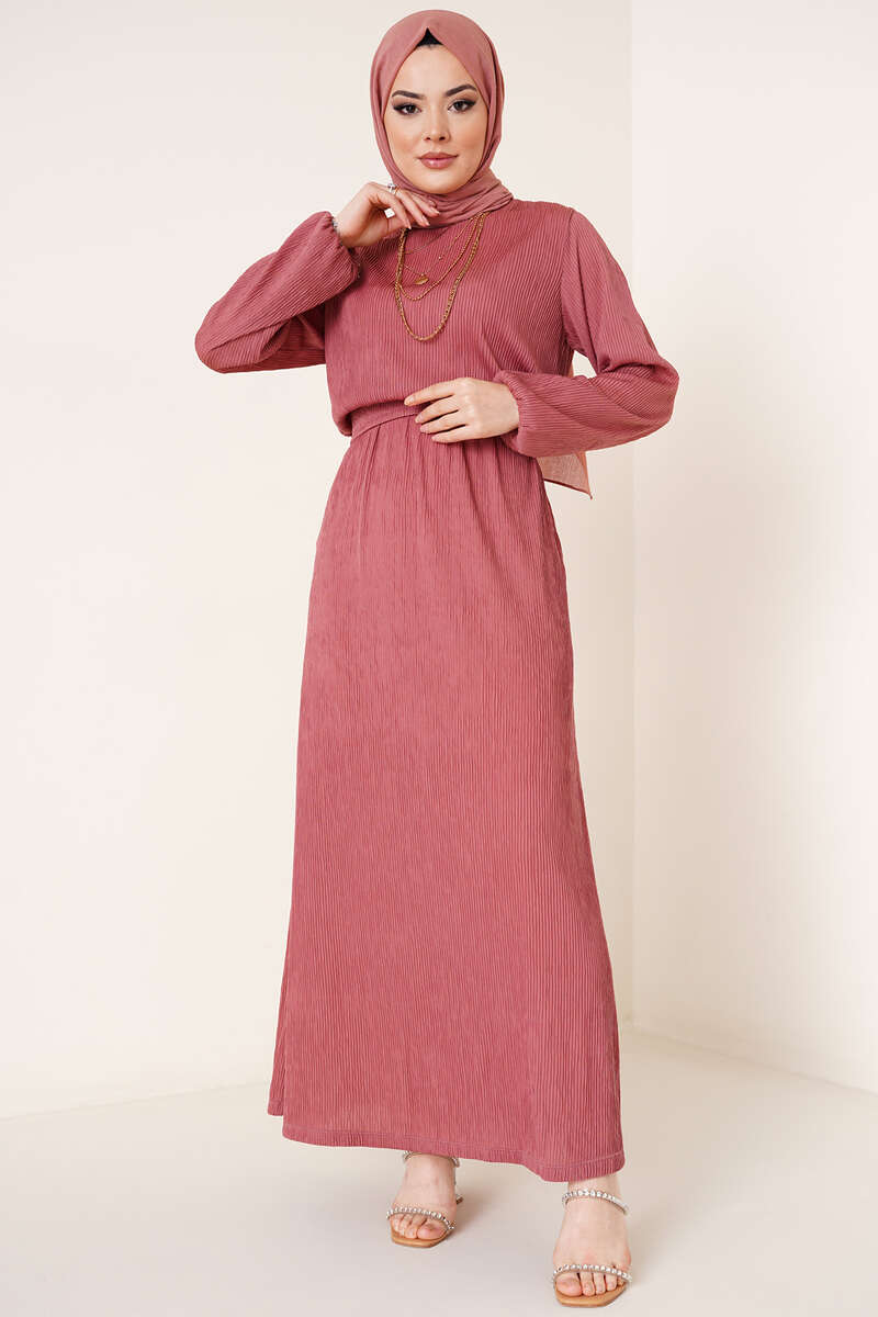 Yeni sezon piliseli elbisemiz bel lastiklidir. Belinde lastiğe eşlik eden kuşağı iki adet kemer köprüsüyle tamamlanmaktadır. Oval yaka olan elbisemizin bilekleri lastiklidir.