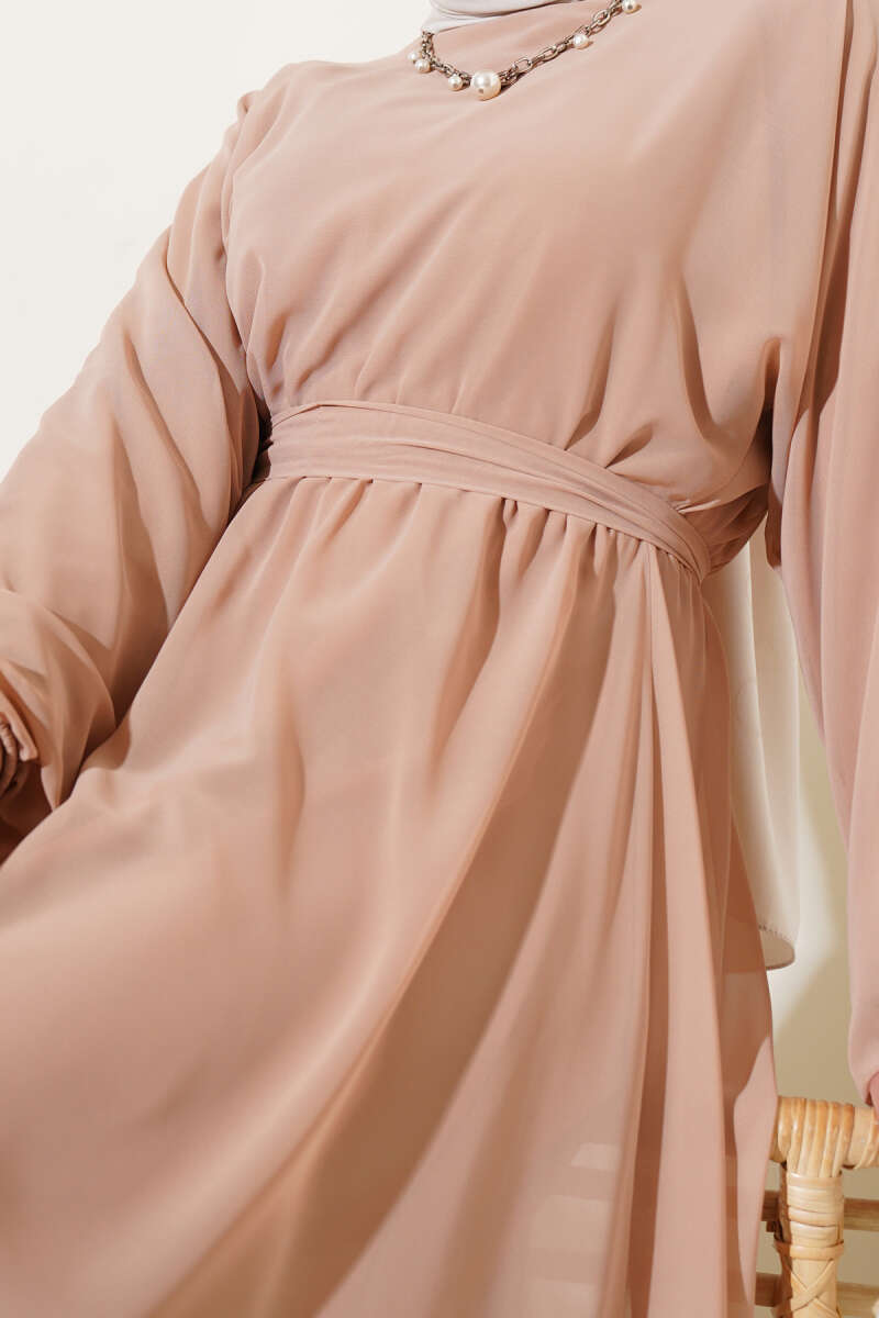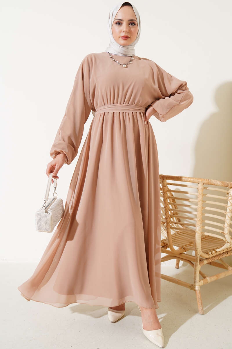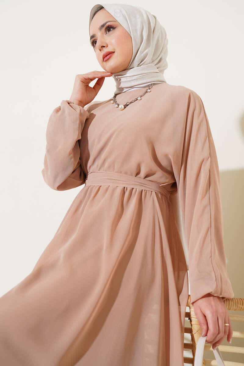 Çift İp Kuşaklı Ekoseli Elbise Bej