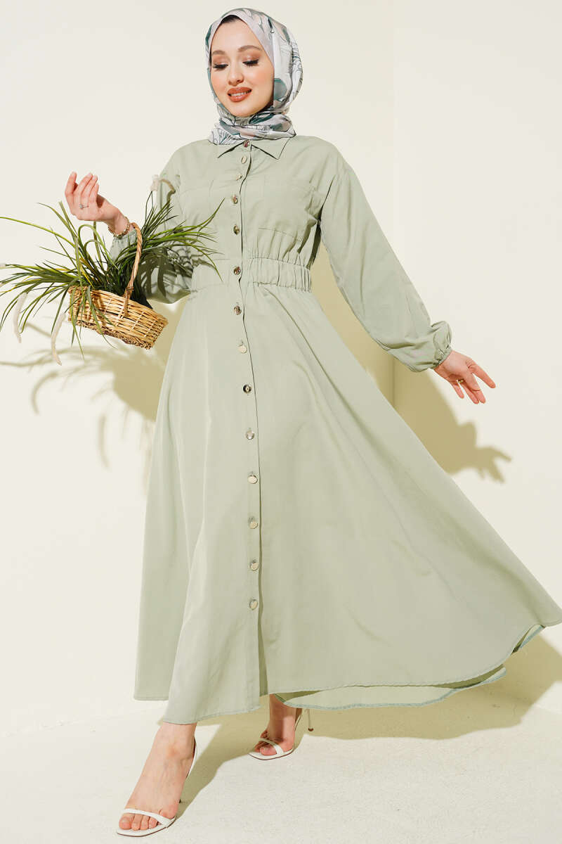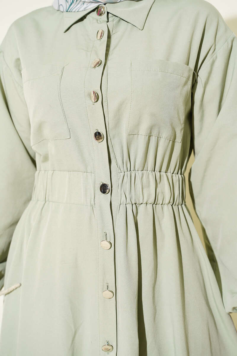 Bel Lastikli Metal Düğmeli Elbise Çağla Yeşili