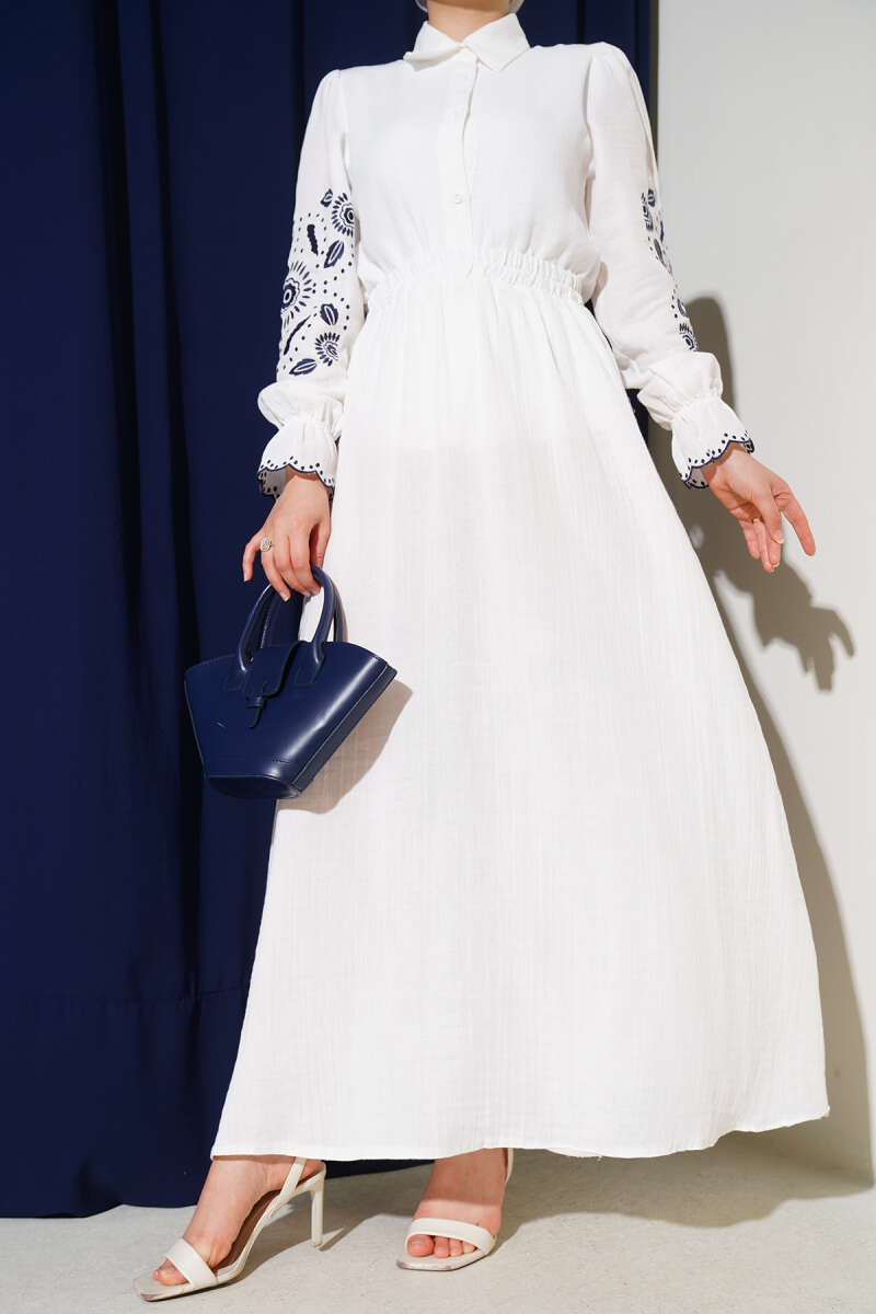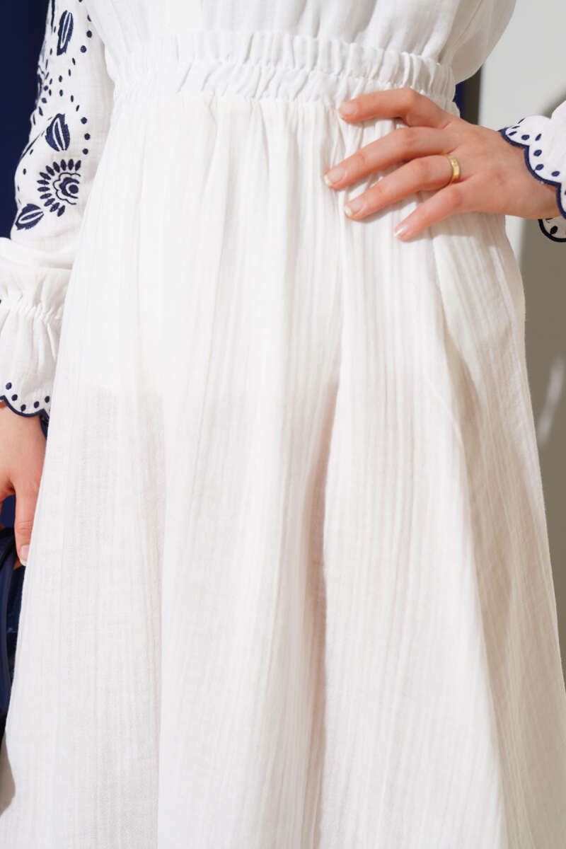 Kruvaze Brodeli Elbise Ekru