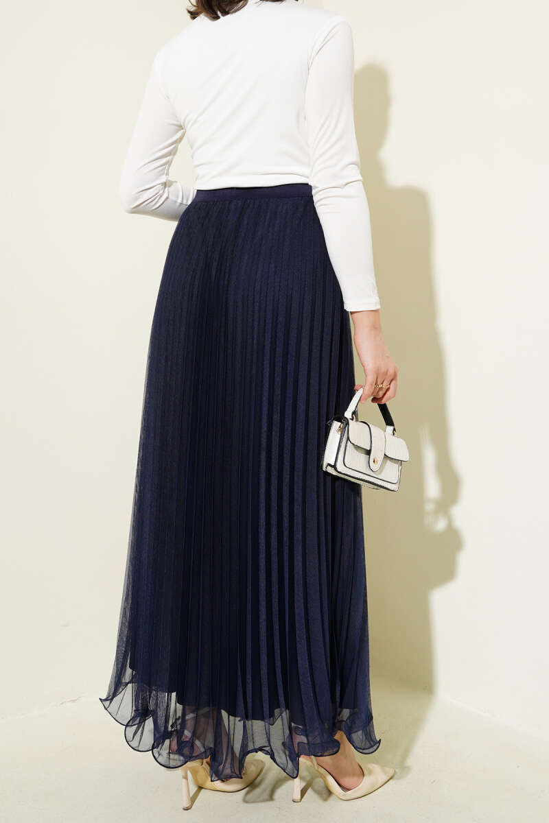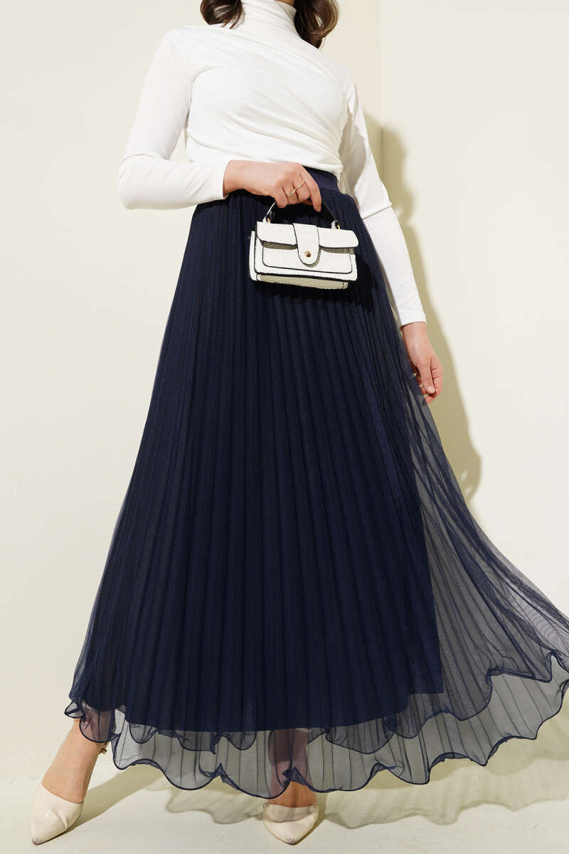 Bel Lastikli Pileli Fırfırlı Tül Etek Lacivert