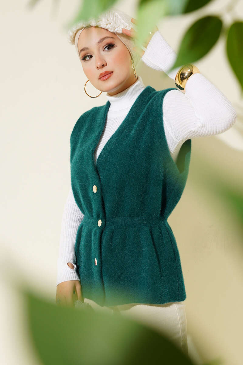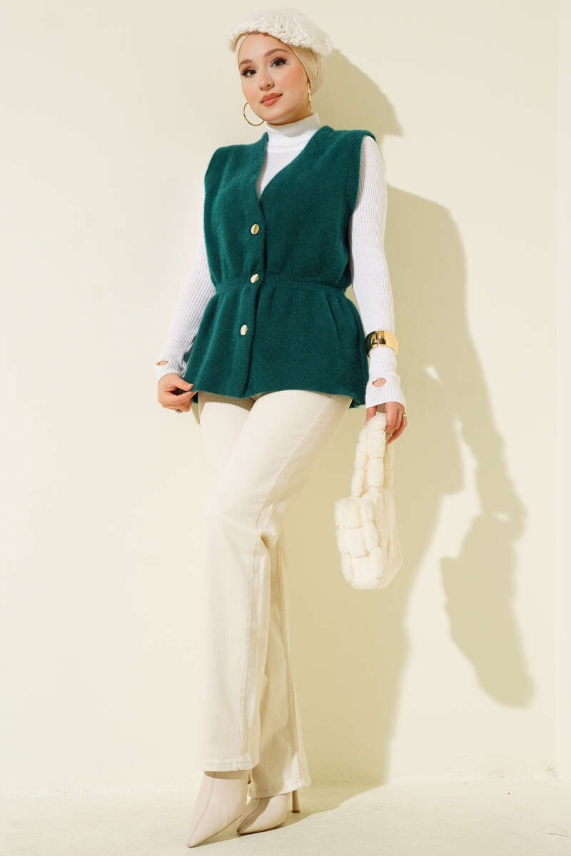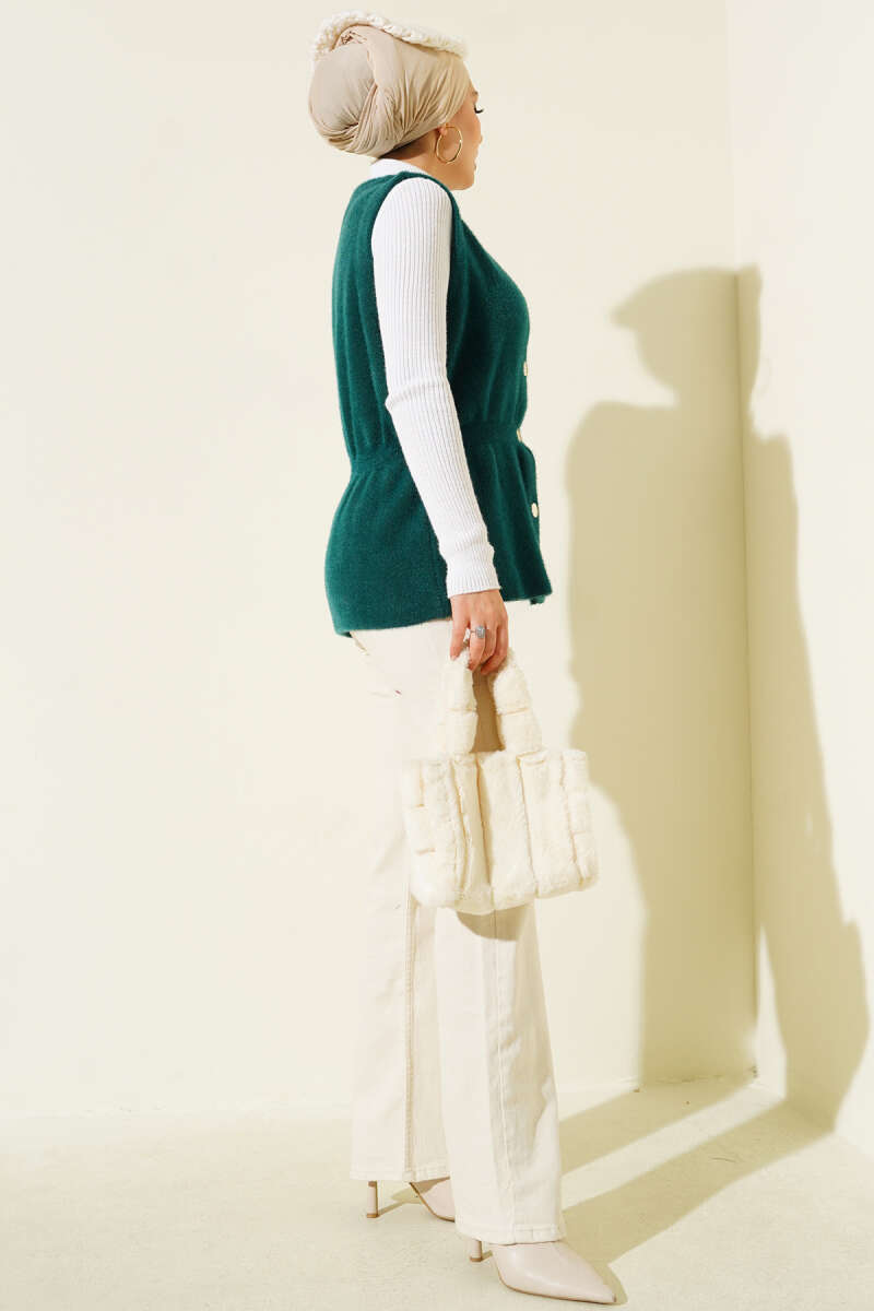 Bel Lastikli Sakallı Triko Yelek Zümrüt