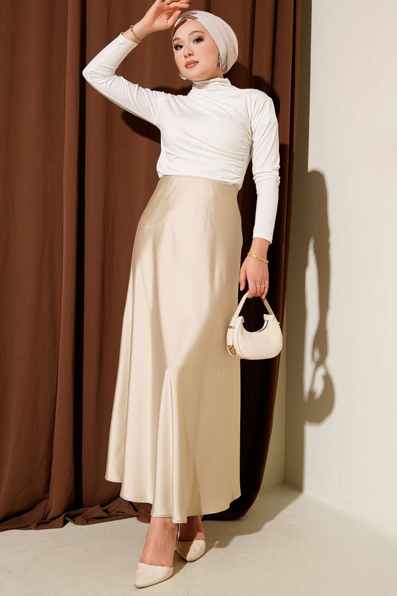 Yan İp Bağcıklı Ekoseli Etek Bej