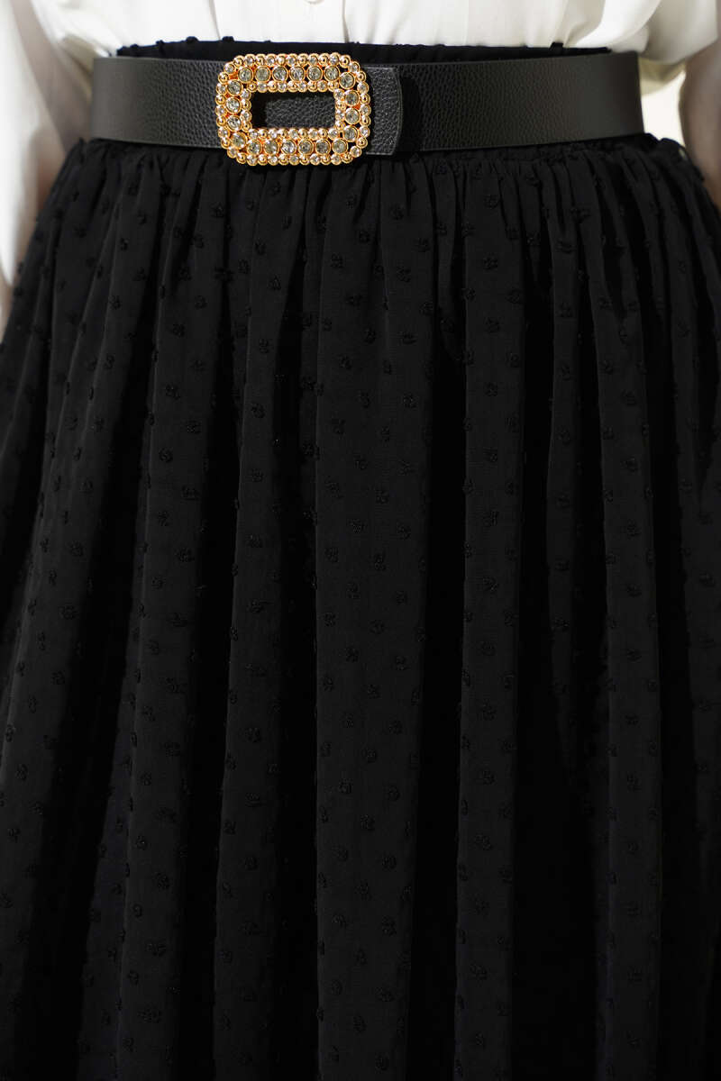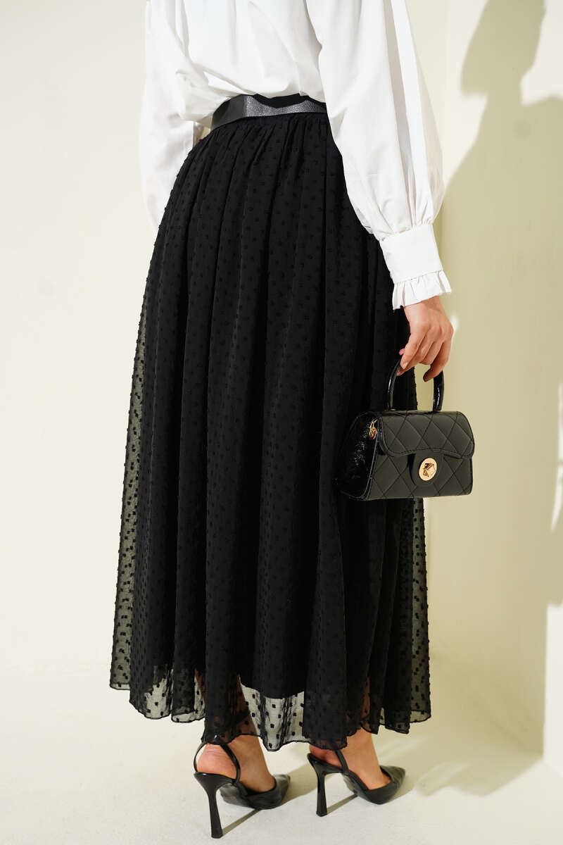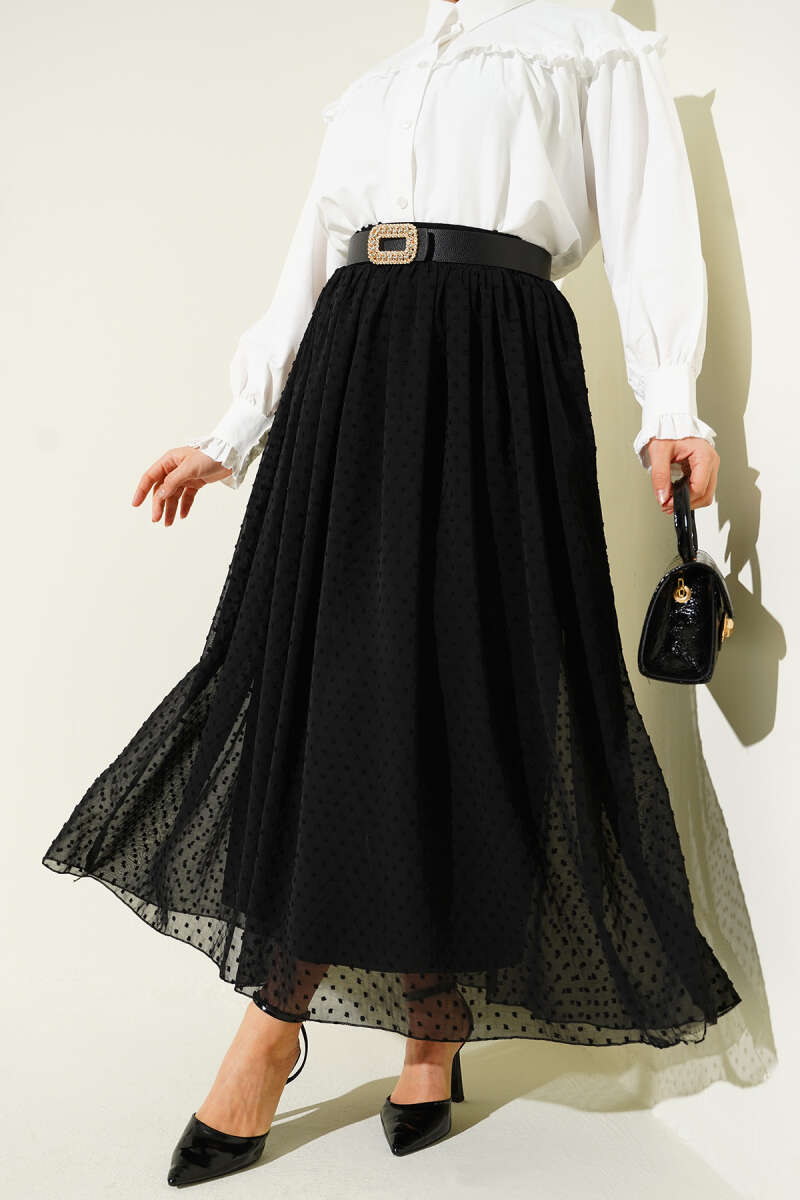 Bel Lastikli Çiçek Desen Tül Etek Siyah