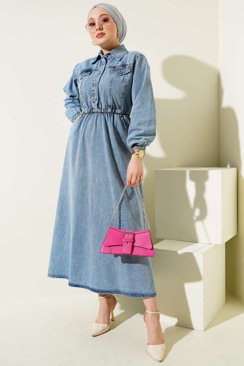 Bel Lastikli Yarım Düğmeli Kot Elbise Kot Mavisi