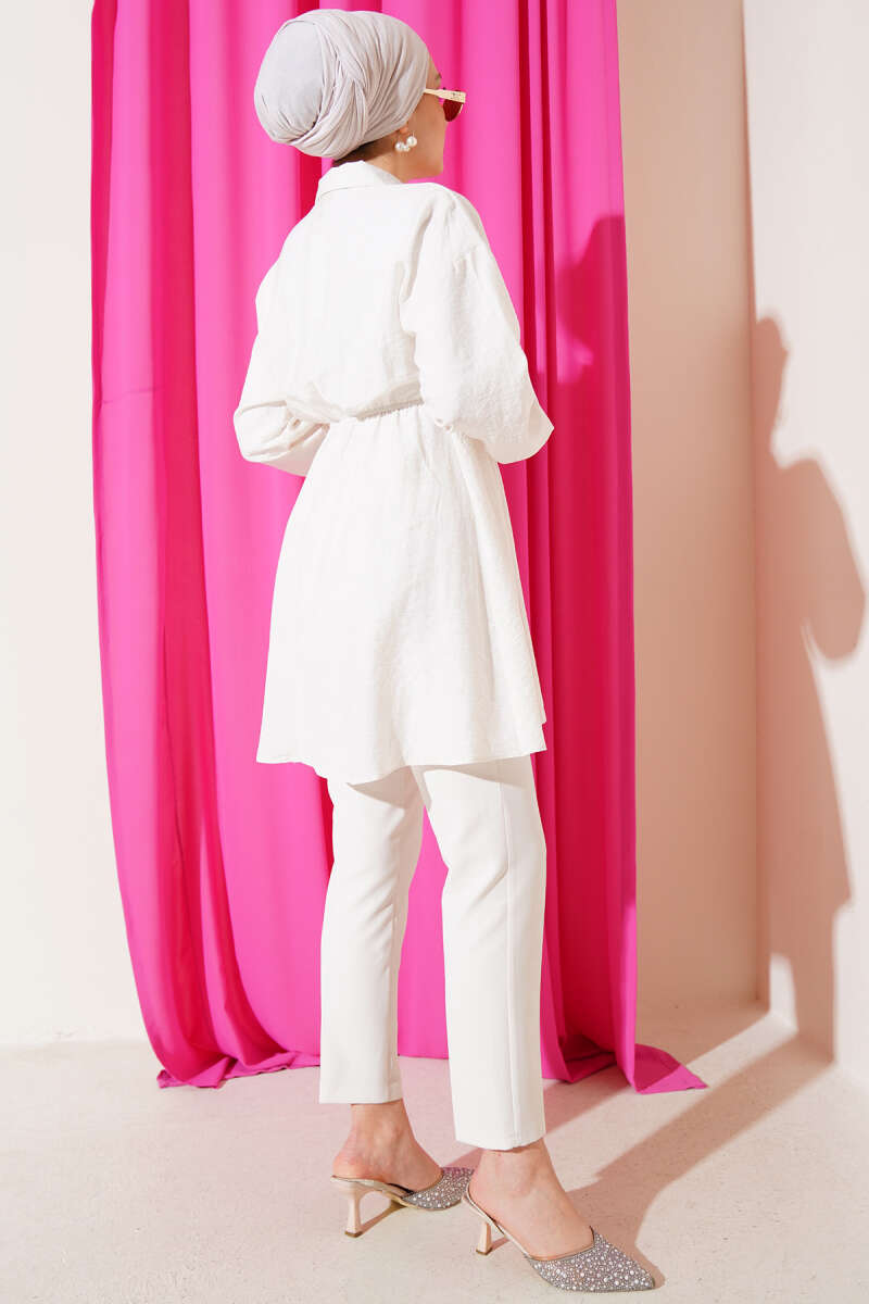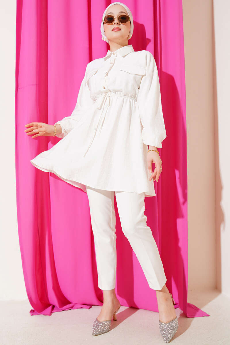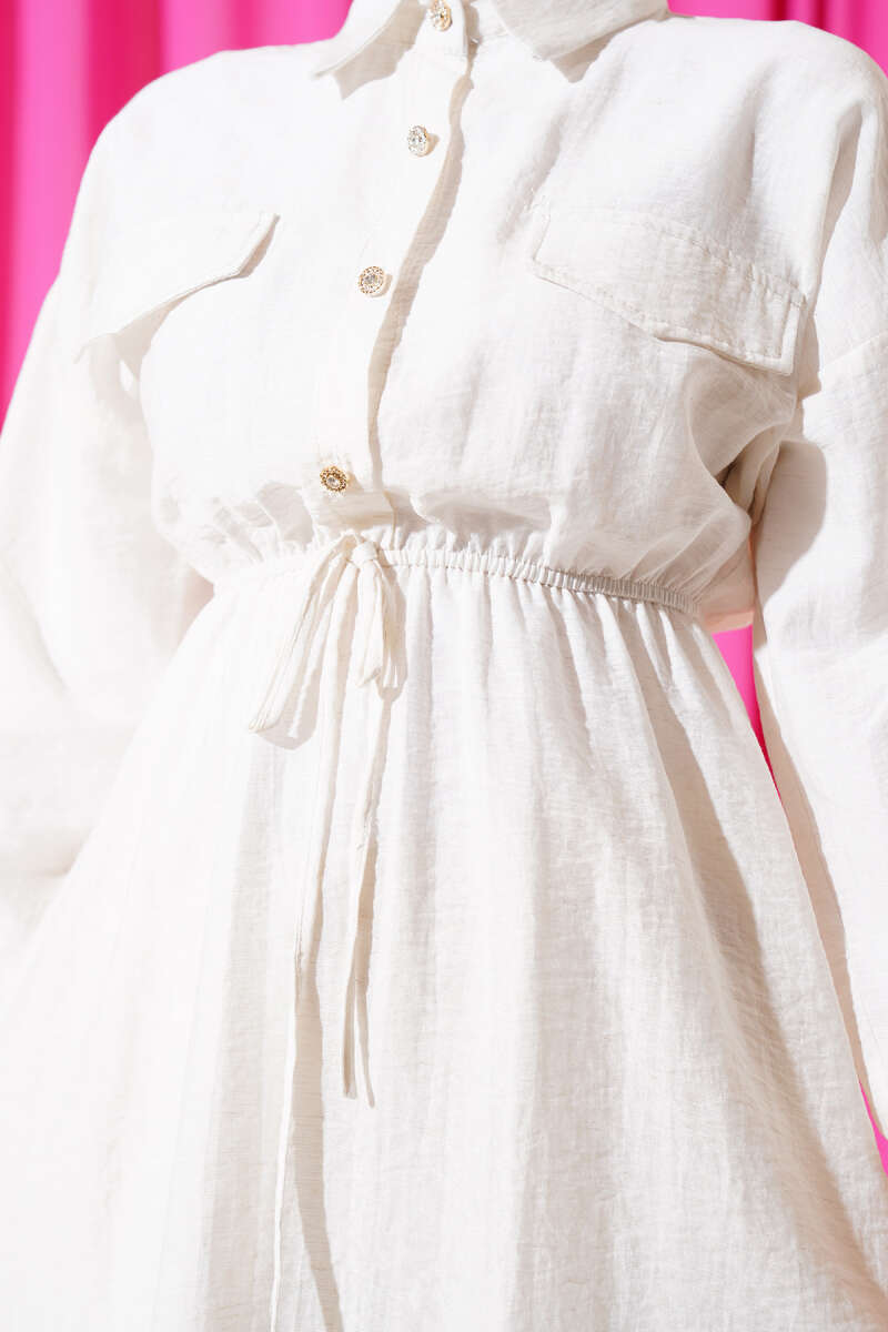 Bel Lastikli Yarım Taş Düğmeli Tunik Ekru