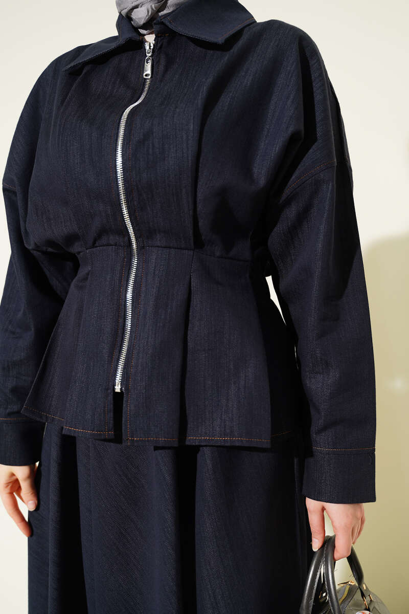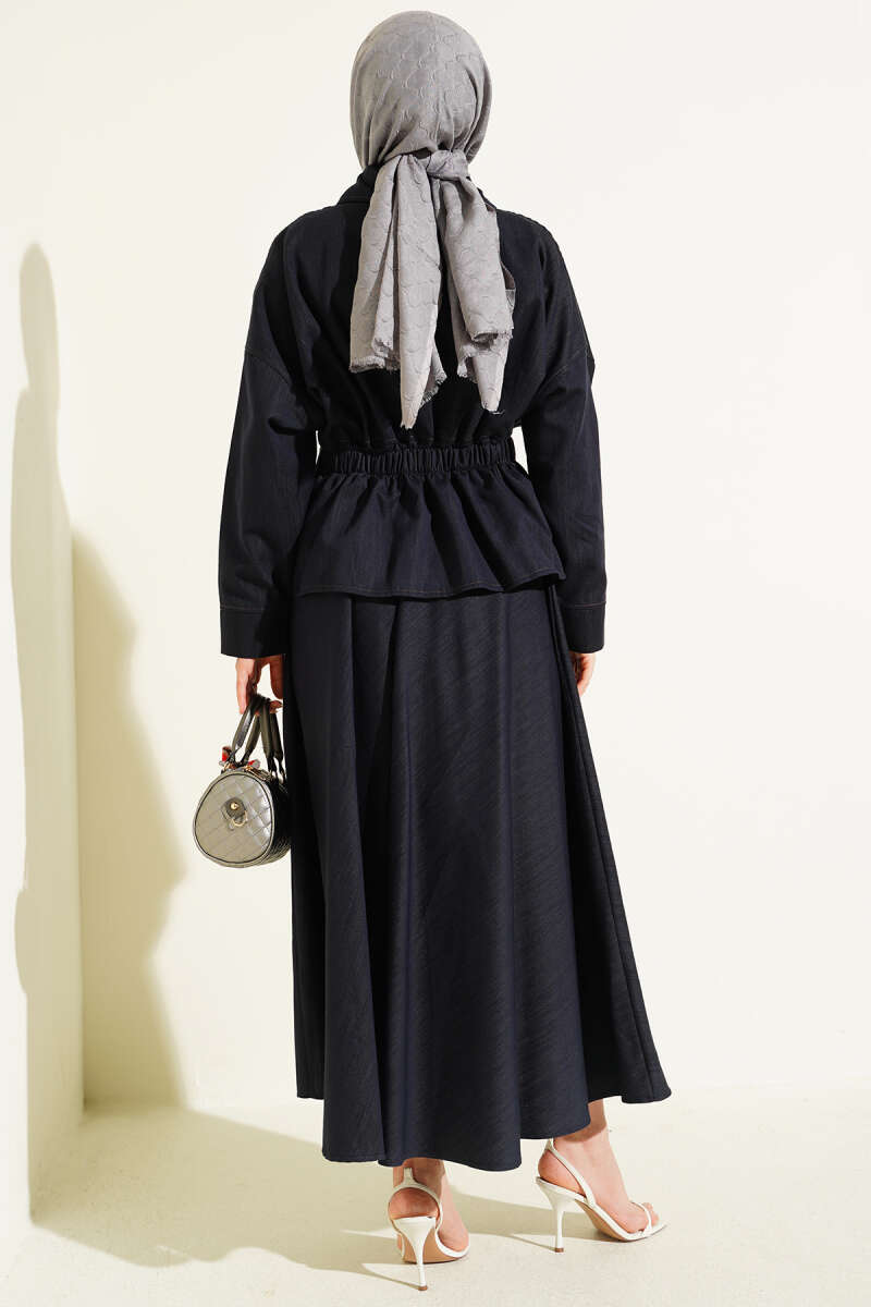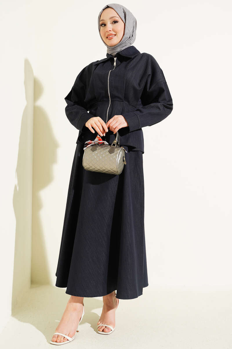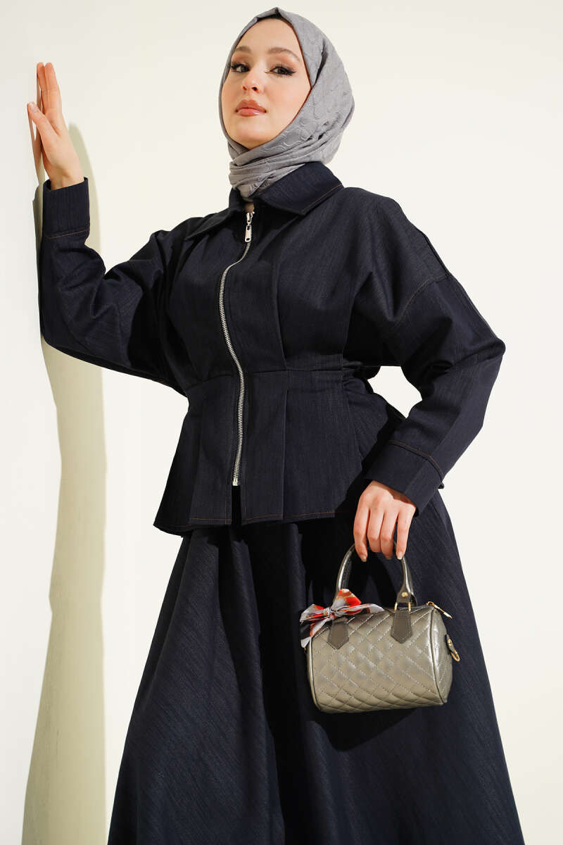 Bel Pensli Fermuarlı Etekli Kot İkili Takım Lacivert
